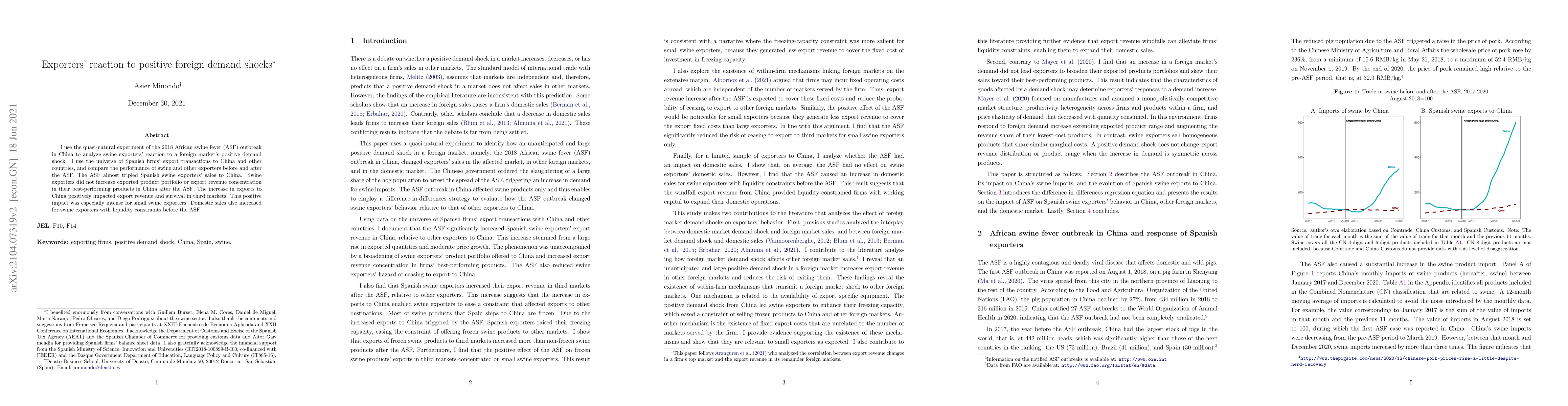 The study analyzes Spanish swine exporters' response to China's increased demand for pork due to the 2018 African swine fever. Utilizing export data before and after the ASF outbreak, it finds that export volumes tripled, boosting revenue and survival rates, especially for small exporters. Domestic sales also rose for liquidity-constrained exporters. No significant changes in product portfolio or concentration in best-performing products occurred.