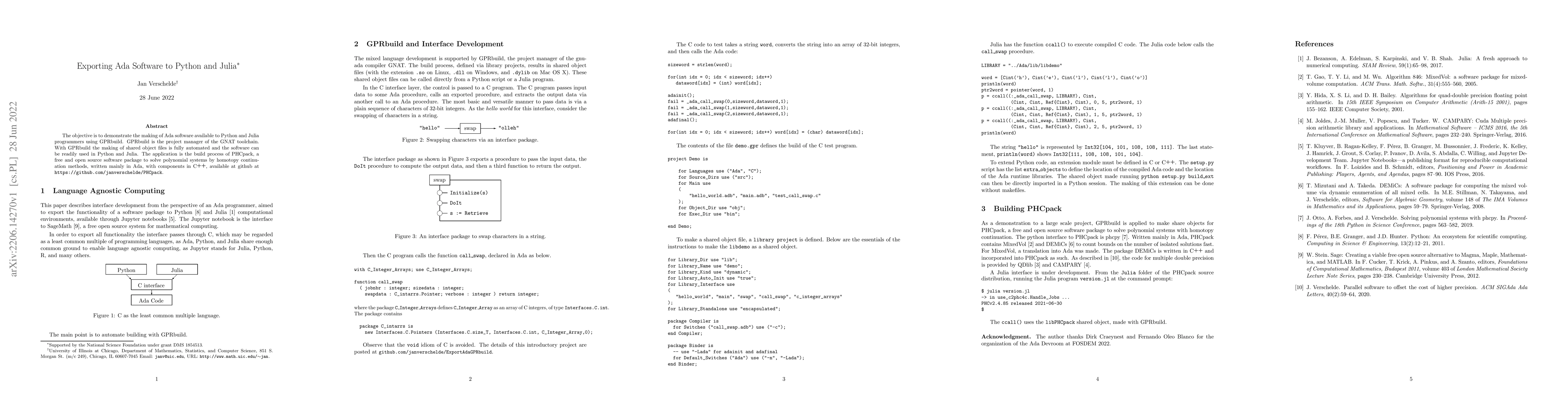 This paper explores using GPRbuild to automate the creation of shared object files from Ada software, enabling its use in Python and Julia. It applies this method to PHCpack, an open-source Ada-based software for solving polynomial systems, demonstrating its integration with Python and Julia.