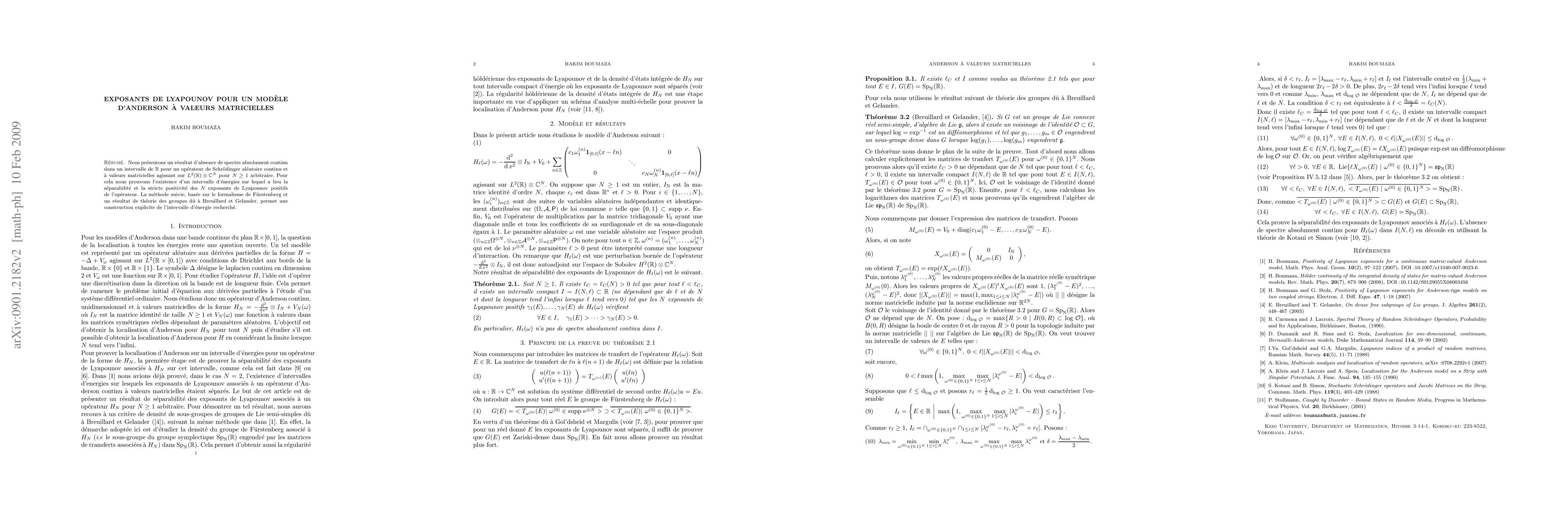 Le papier présente un résultat prouvant l'absence de spectre absolument continu pour un opérateur de Schrödinger à valeurs matricielles, et démontre l'existence d'un intervalle d'énergies où les exposants de Lyapounov sont séparables et strictement positifs, en utilisant le formalisme de Fränkfurt et des résultats de théorie des groupes.