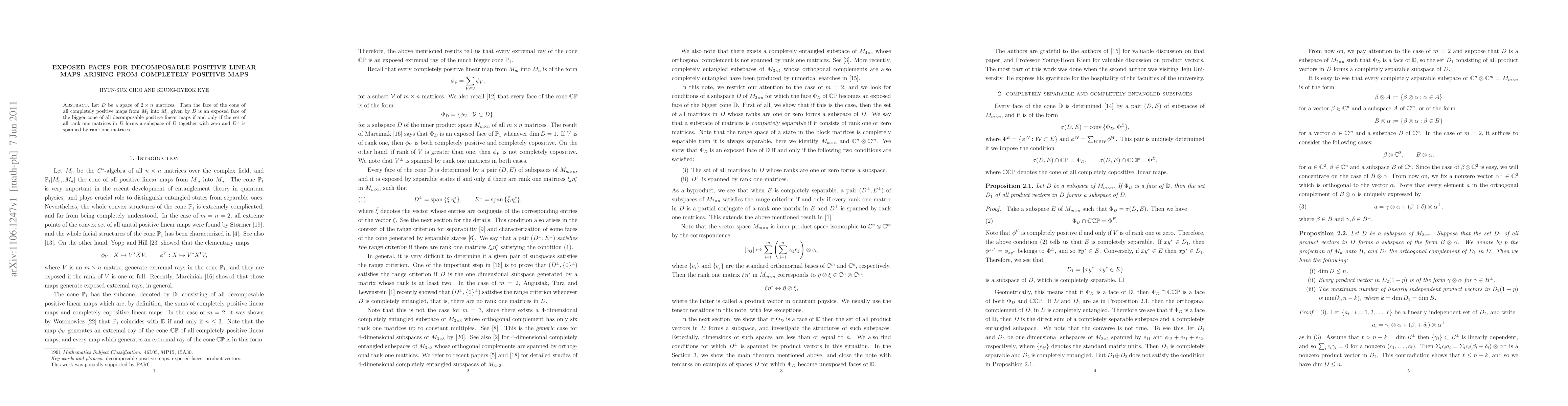 Summary: The face of the cone of completely positive maps from $M_2$ to $M_n$ determined by $D$ is an exposed face of the cone of decomposable positive linear maps if and only if the set of rank one matrices in $D$ forms a subspace, and $D^\perp$ is spanned by rank one matrices.