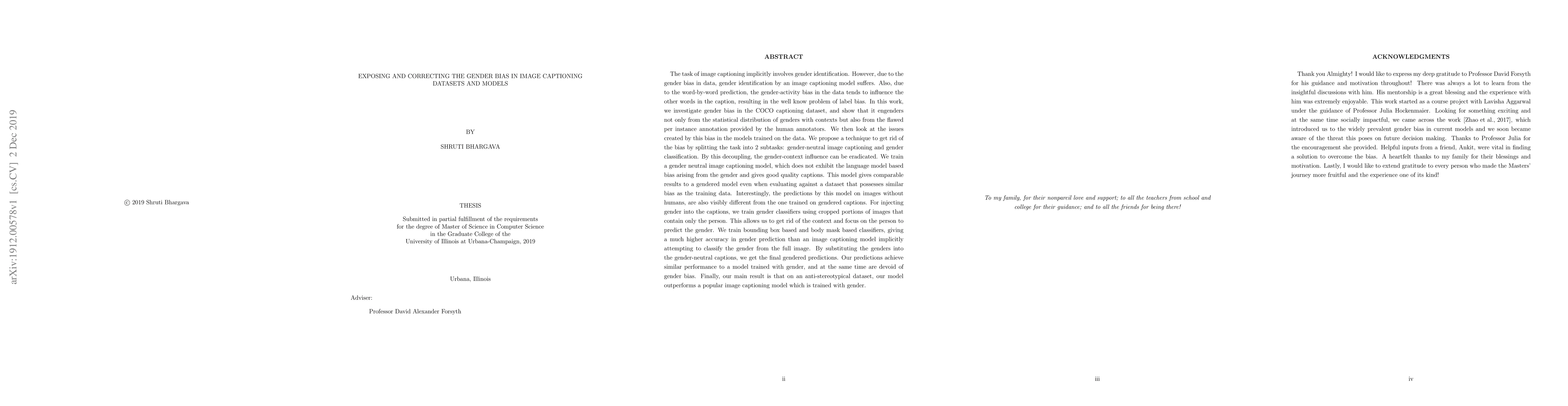 This paper investigates and corrects gender bias in image captioning datasets and models, identifying issues from both dataset distribution and flawed human annotations. It proposes a method to decouple gender identification from image captioning, achieving comparable results without gender bias and outperforming traditional models on anti-stereotypical datasets.