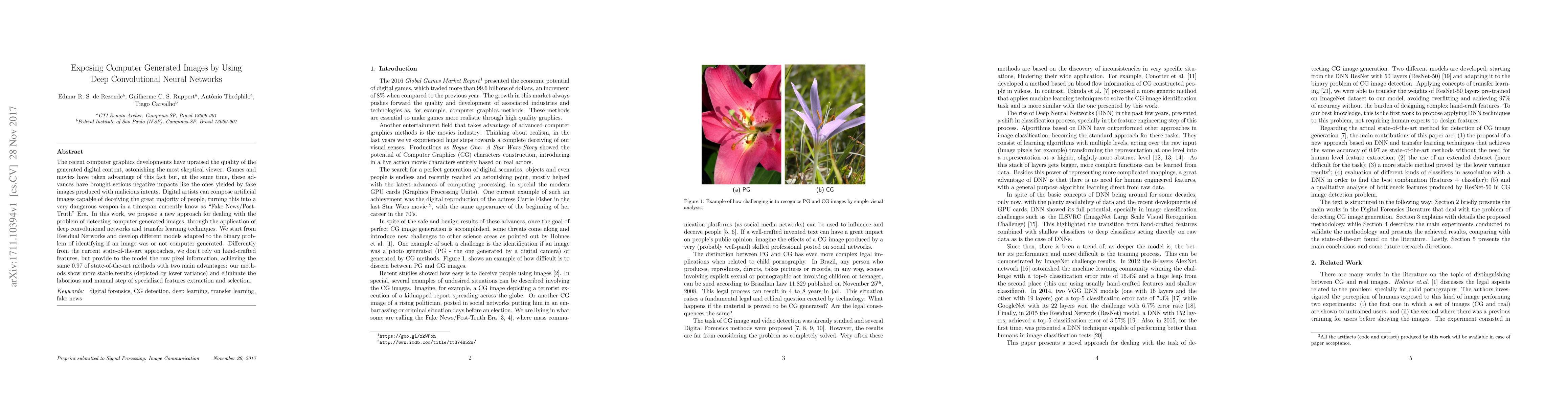 The recent computer graphics developments have upraised the quality of the generated digital content, astonishing the most skeptical viewer. Games and movies have taken advantage of this fact but, at the same time, these advances have brought serious negative impacts like the ones yielded by fakeimages produced with malicious intents. Digital artists can compose artificial images capable of deceiving the great majority of people, turning this into a very dangerous weapon in a timespan currently know as Fake News/Post-Truth" Era. In this work, we propose a new approach for dealing with the problem of detecting computer generated images, through the application of deep convolutional networks and transfer learning techniques. We start from Residual Networks and develop different models adapted to the binary problem of identifying if an image was or not computer generated. Differently from the current state-of-the-art approaches, we don't rely on hand-crafted features, but provide to the model the raw pixel information, achieving the same 0.97 of state-of-the-art methods with two main advantages: our methods show more stable results (depicted by lower variance) and eliminate the laborious and manual step of specialized features extraction and selection.