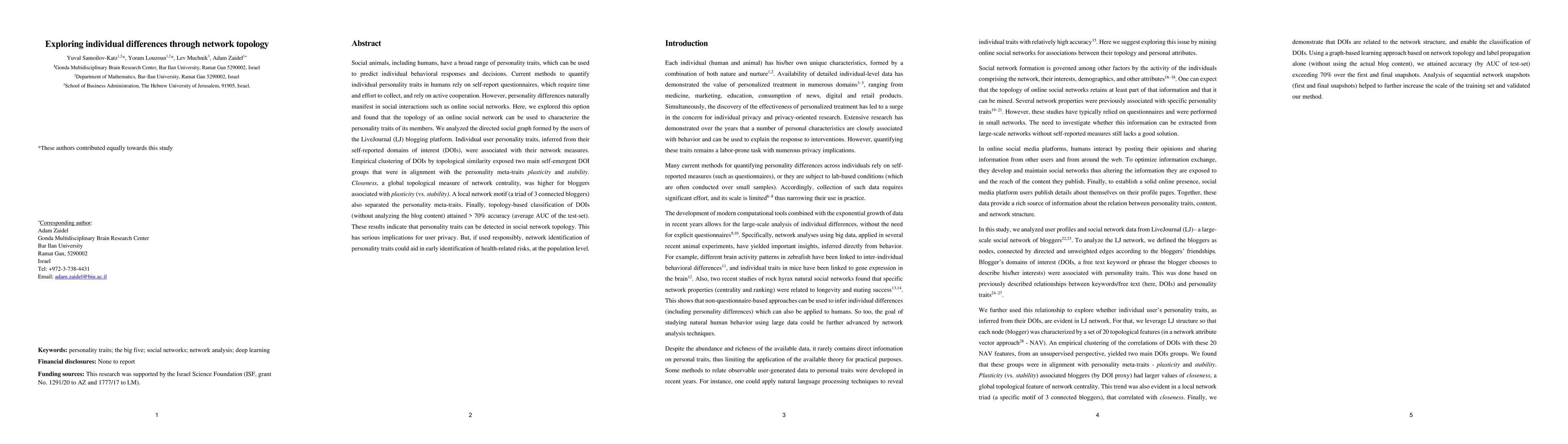 Social animals, including humans, have a broad range of personality traits, which can be used to predict individual behavioral responses and decisions. Current methods to quantify individual personality traits in humans rely on self-report questionnaires, which require time and effort to collect and rely on active cooperation. However, personality differences naturally manifest in social interactions such as online social networks. Here, we demonstrate that the topology of an online social network can be used to characterize the personality traits of its members. We analyzed the directed social graph formed by the users of the LiveJournal (LJ) blogging platform. Individual users personality traits, inferred from their self-reported domains of interest (DOIs), were associated with their network measures. Empirical clustering of DOIs by topological similarity exposed two main self-emergent DOI groups that were in alignment with the personality meta-traits plasticity and stability. Closeness, a global topological measure of network centrality, was significantly higher for bloggers associated with plasticity (vs. stability). A local network motif (a triad of 3 connected bloggers) that correlated with closeness also separated the personality meta-traits. Finally, topology-based classification of DOIs (without analyzing the content of the blogs) attained > 70% accuracy (average AUC of the test-set). These results indicate that personality traits are evident and detectable in network topology. This has serious implications for user privacy. But, if used responsibly, network identification of personality traits could aid in early identification of health-related risks, at the population level.