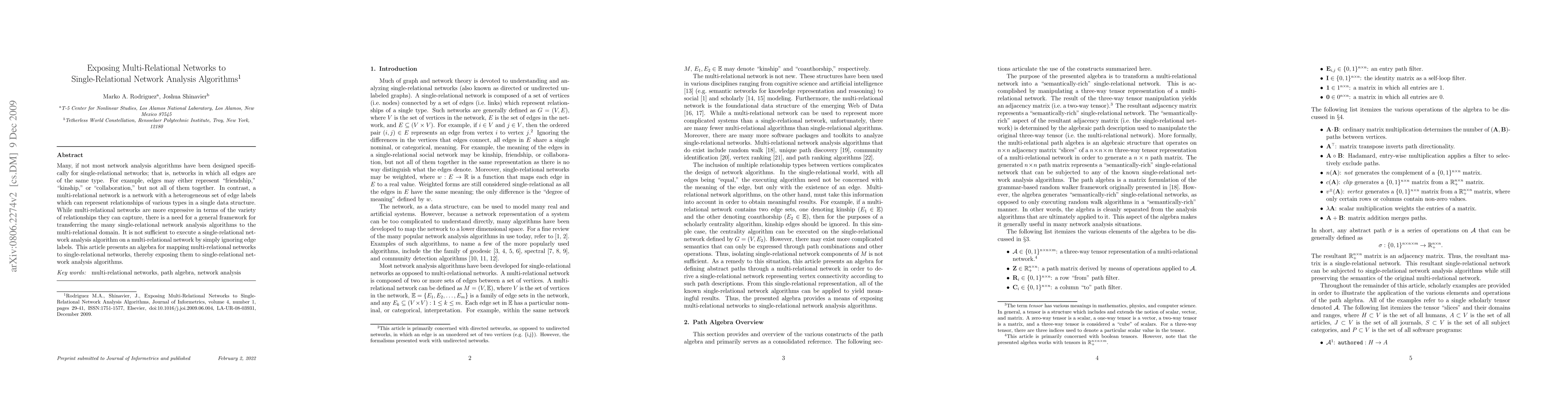 This paper introduces an algebra for transforming multi-relational networks into single-relational networks, enabling the application of existing single-relational network analysis algorithms to more complex, heterogeneous network structures. The proposed framework aims to bridge the gap between single-relational and multi-relational network analysis.