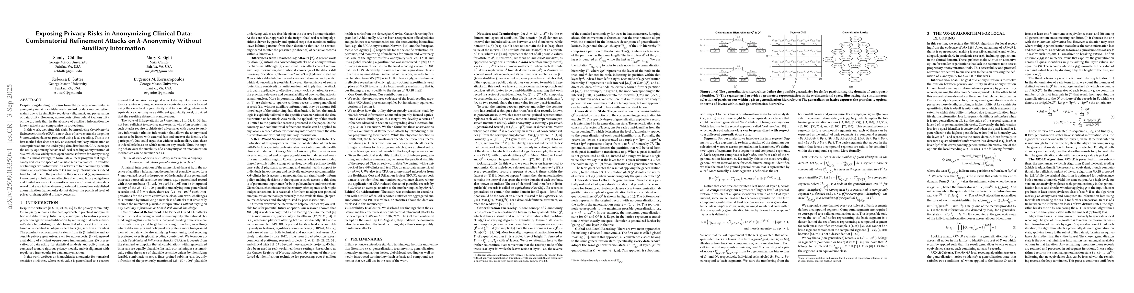 Despite longstanding criticism from the privacy community, k-anonymity remains a widely used standard for data anonymization, mainly due to its simplicity, regulatory alignment, and preservation of data utility. However, non-experts often defend k-anonymity on the grounds that, in the absence of auxiliary information, no known attacks can compromise its protections. In this work, we refute this claim by introducing Combinatorial Refinement Attacks (CRA), a new class of privacy attacks targeting k-anonymized datasets produced using local recoding. This is the first method that does not rely on external auxiliary information or assumptions about the underlying data distribution. CRA leverages the utility-optimizing behavior of local recoding anonymization of ARX, which is a widely used open-source software for anonymizing data in clinical settings, to formulate a linear program that significantly reduces the space of plausible sensitive values. To validate our findings, we partnered with a network of free community health clinics, an environment where (1) auxiliary information is indeed hard to find due to the population they serve and (2) open-source k-anonymity solutions are attractive due to regulatory obligations and limited resources. Our results on real-world clinical microdata reveal that even in the absence of external information, established anonymization frameworks do not deliver the promised level of privacy, raising critical privacy concerns.