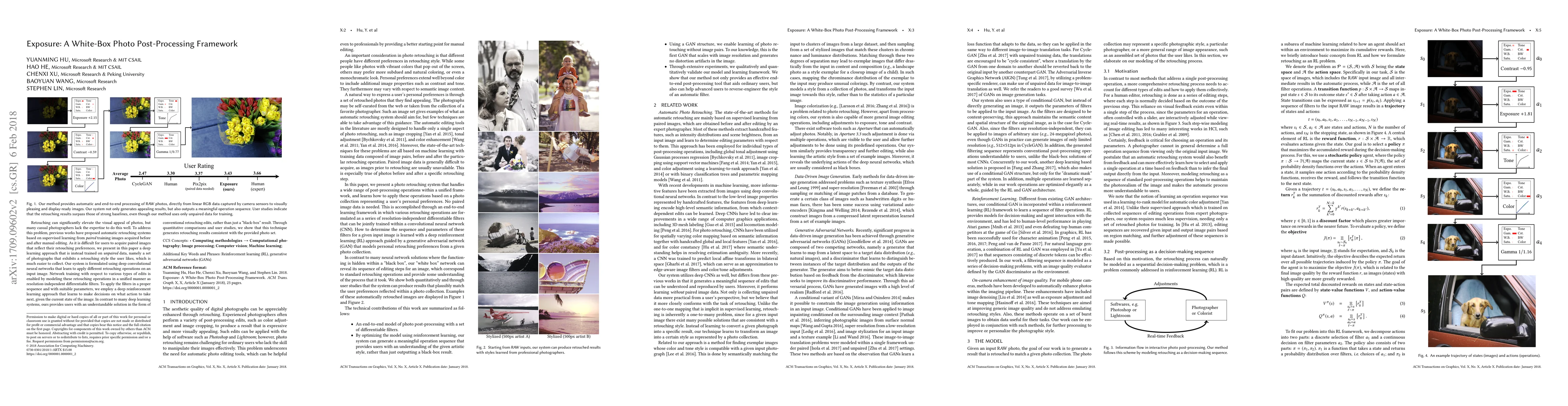 This paper introduces a deep learning framework for photo retouching that trains on unpaired data, enabling users to achieve desired retouching styles without needing paired edited images. The system uses convolutional neural networks and reinforcement learning to apply resolution-independent filters in a sequence that mimics conventional retouching edits, providing a transparent solution rather than a black-box result.