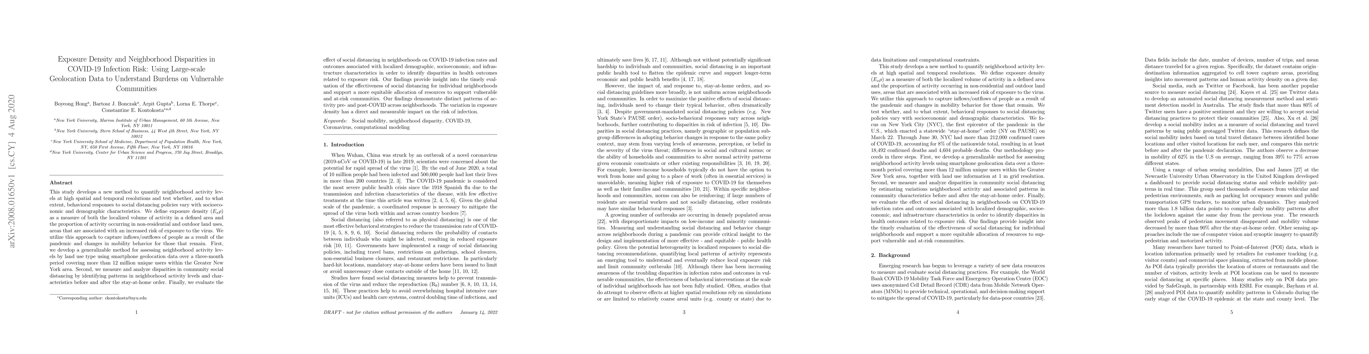 This study develops a new method to quantify neighborhood activity levels at high spatial and temporal resolutions and test whether, and to what extent, behavioral responses to social distancing policies vary with socioeconomic and demographic characteristics. We define exposure density as a measure of both the localized volume of activity in a defined area and the proportion of activity occurring in non-residential and outdoor land uses. We utilize this approach to capture inflows/outflows of people as a result of the pandemic and changes in mobility behavior for those that remain. First, we develop a generalizable method for assessing neighborhood activity levels by land use type using smartphone geolocation data over a three-month period covering more than 12 million unique users within the Greater New York area. Second, we measure and analyze disparities in community social distancing by identifying patterns in neighborhood activity levels and characteristics before and after the stay-at-home order. Finally, we evaluate the effect of social distancing in neighborhoods on COVID-19 infection rates and outcomes associated with localized demographic, socioeconomic, and infrastructure characteristics in order to identify disparities in health outcomes related to exposure risk. Our findings provide insight into the timely evaluation of the effectiveness of social distancing for individual neighborhoods and support a more equitable allocation of resources to support vulnerable and at-risk communities. Our findings demonstrate distinct patterns of activity pre- and post-COVID across neighborhoods. The variation in exposure density has a direct and measurable impact on the risk of infection.