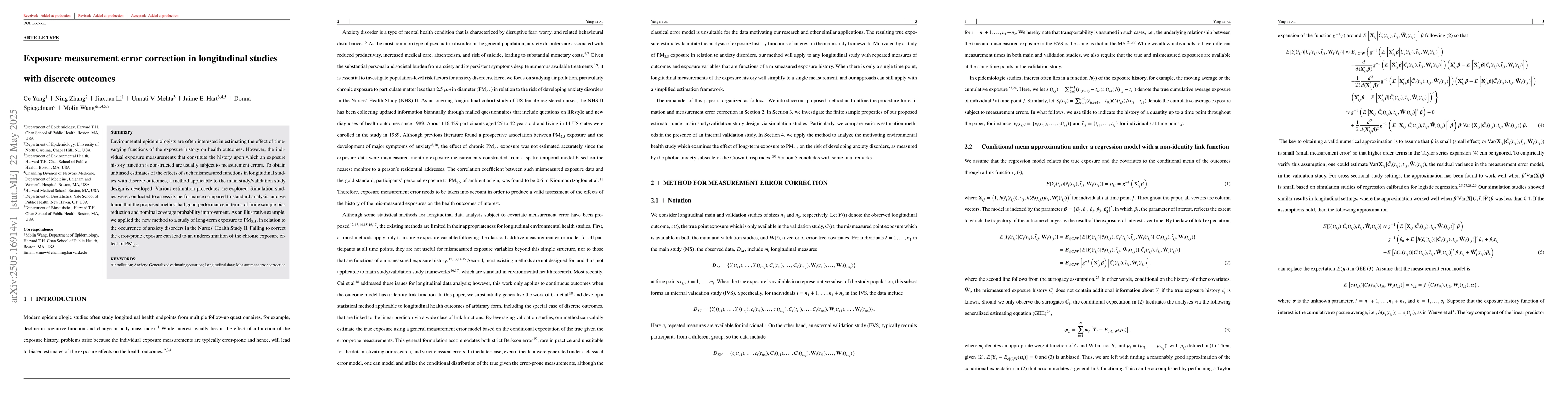 Development of a correction method for exposure measurement error in longitudinal studies with discrete outcomes, enhancing the accuracy of effect estimation from mismeasured time-varying exposure history functions.