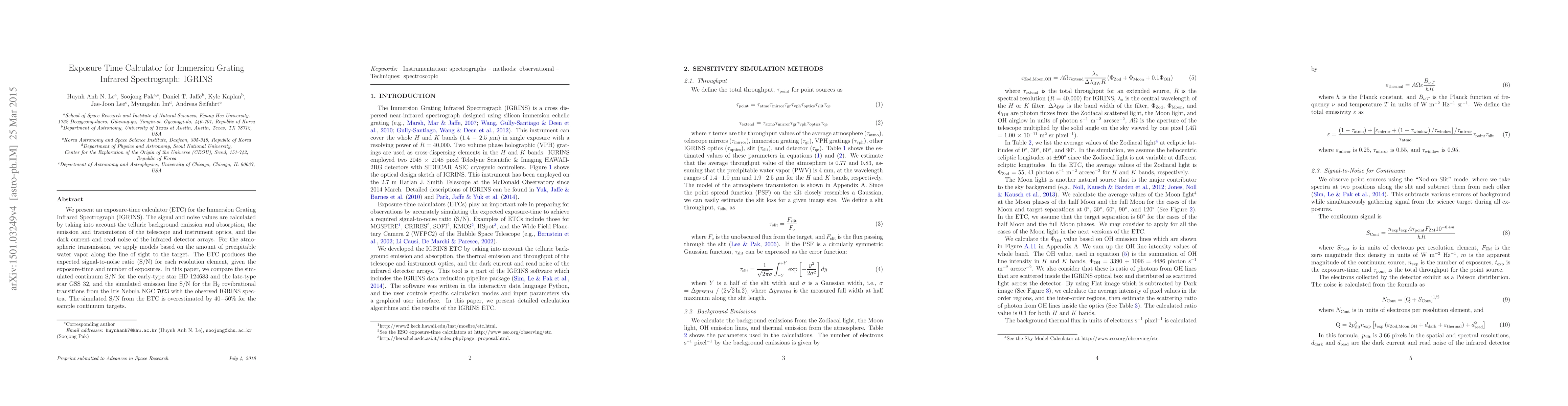The paper presents an Exposure-Time Calculator (ETC) for the Immersion Grating Infrared Spectrograph (IGRINS), considering telluric background emission and absorption, telescope and instrument optics emission and transmission, and detector dark current and read noise to estimate signal-to-noise ratio (S/N) for each resolution element.