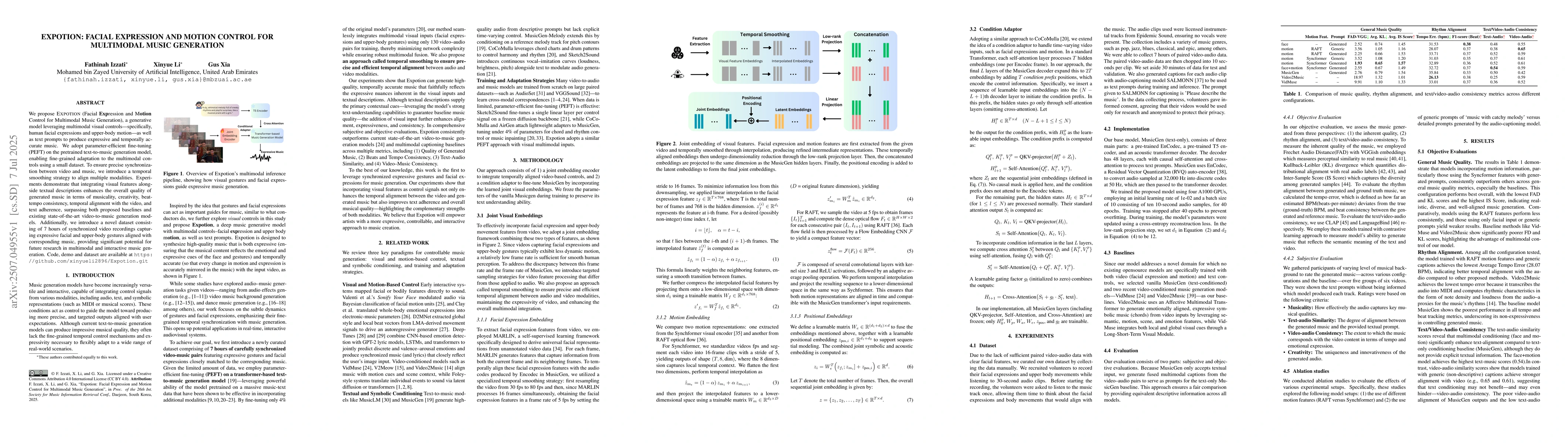 We propose Expotion (Facial Expression and Motion Control for Multimodal Music Generation), a generative model leveraging multimodal visual controls - specifically, human facial expressions and upper-body motion - as well as text prompts to produce expressive and temporally accurate music. We adopt parameter-efficient fine-tuning (PEFT) on the pretrained text-to-music generation model, enabling fine-grained adaptation to the multimodal controls using a small dataset. To ensure precise synchronization between video and music, we introduce a temporal smoothing strategy to align multiple modalities. Experiments demonstrate that integrating visual features alongside textual descriptions enhances the overall quality of generated music in terms of musicality, creativity, beat-tempo consistency, temporal alignment with the video, and text adherence, surpassing both proposed baselines and existing state-of-the-art video-to-music generation models. Additionally, we introduce a novel dataset consisting of 7 hours of synchronized video recordings capturing expressive facial and upper-body gestures aligned with corresponding music, providing significant potential for future research in multimodal and interactive music generation.