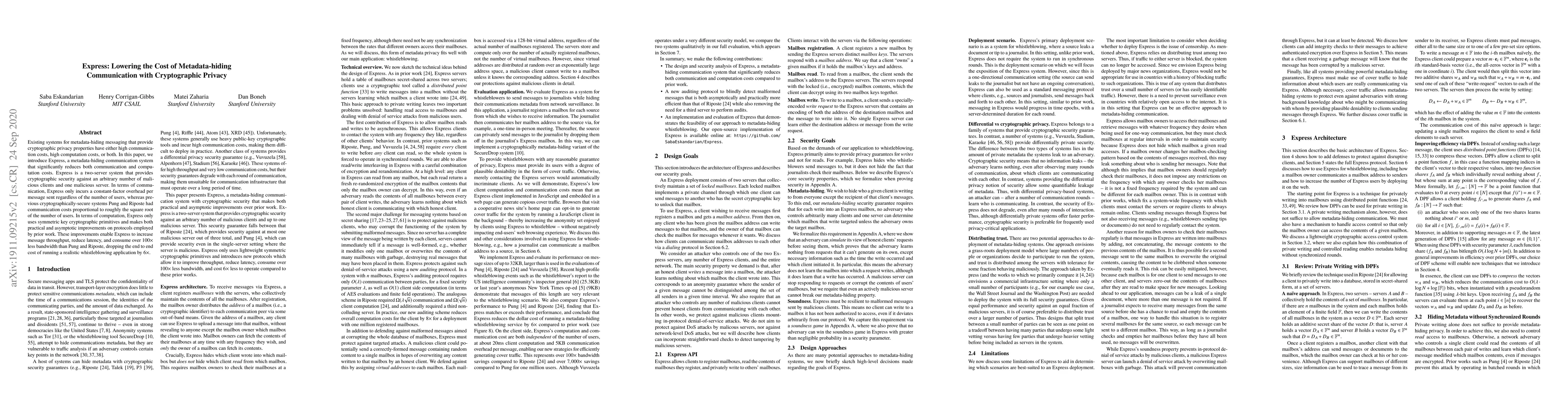 This paper introduces Express, a new metadata-hiding communication system that drastically reduces both communication and computation costs compared to existing systems like Pung and Riposte. Express uses symmetric key cryptography and has a constant-factor communication overhead per message, significantly improving message throughput and reducing bandwidth by over 100x.