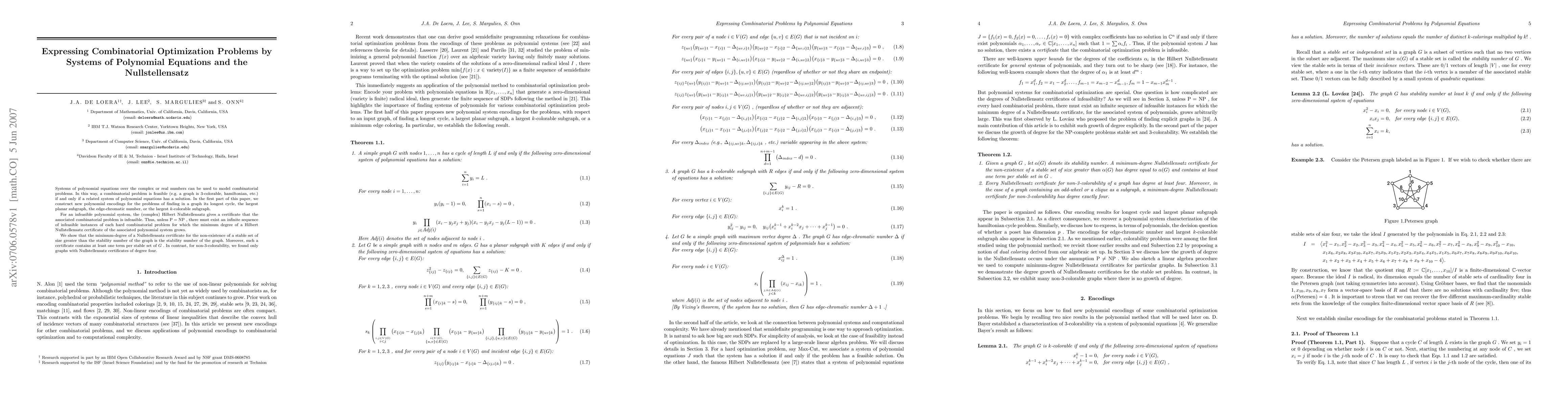 This paper constructs polynomial encodings for various combinatorial optimization problems and uses the Hilbert Nullstellensatz to certify infeasibility. It finds that the minimum degree of a Nullstellensatz certificate for non-existence of a stable set correlates with the graph's stability number, contrasting with certificates for non-3-colorability, which are typically of degree four.