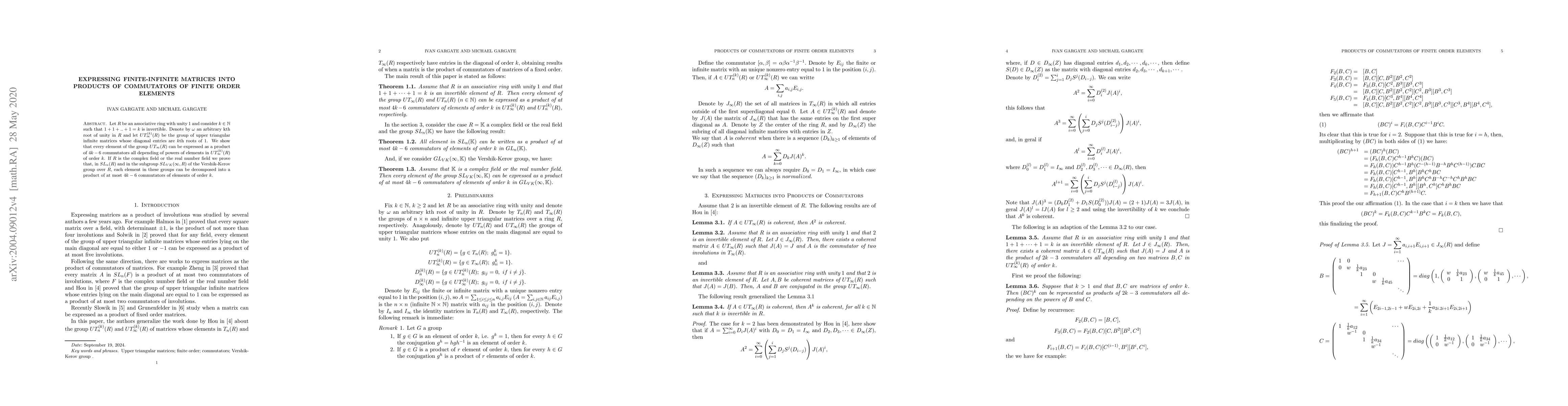 Let $R$ be an associative ring with unity $1$ and consider $k\in \mathbb{N}$ such that $1+1+..+1=k$ is invertible. Denote by $\omega$ an arbitrary kth root of unity in $R$ and let $UT^{(k)}_{\infty}(R)$ be the group of upper triangular infinite matrices whose diagonal entries are $k$th roots of $1$. We show that every element of the group $UT_{\infty}(R)$ can be expressed as a product of $4k-6$ commutators all depending of powers of elements in $UT^{(k)}_{\infty}(R)$ of order $k$. If $R$ is the complex field or the real number field we prove that, in $SL_n(R)$ and in the subgroup $SL_{VK}(\infty,R)$ of the Vershik-Kerov group over $R$, each element in these groups can be decomposed into a product of at most $4k-6$ commutators of elements of order $k$.