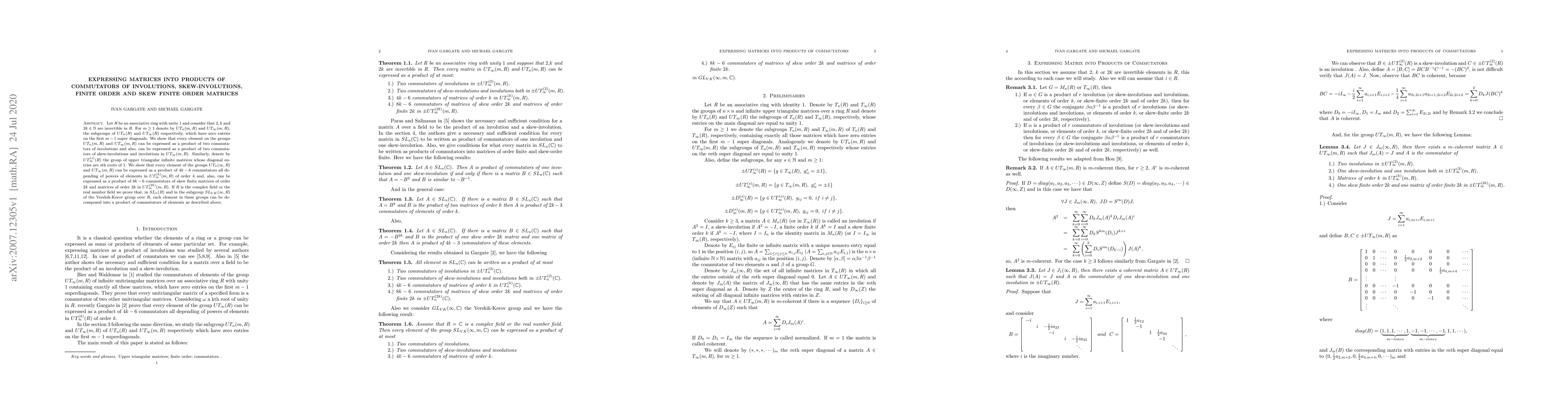 Let $R$ be an associative ring with unity $1$ and consider that $2,k$ and $2k\in \mathbb{N}$ are invertible in $R$. For $m\geq 1$ denote by $UT_n(m,R)$ and $UT_{\infty}(m,R)$, the subgroups of $UT_n(R)$ and $UT_{\infty}(R)$ respectively, which have zero entries on the first $m-1$ super diagonals. We show that every element on the groups $UT_n(m,R)$ and $UT_{\infty}(m,R)$ can be expressed as a product of two commutators of involutions and also, can be expressed as a product of two commutators of skew-involutions and involutions in $UT_{\infty}(m,R)$. Similarly, denote by $UT^{(s)}_{\infty}(R)$ the group of upper triangular infinite matrices whose diagonal entries are $s$th roots of $1$. We show that every element of the groups $UT_n(\infty,R)$ and $UT_{\infty}(m,R)$ can be expressed as a product of $4k-6$ commutators all depending of powers of elements in $UT^{(k)}_{\infty}(m,R)$ of order $k$ and, also, can be expressed as a product of $8k-6$ commutators of skew finite matrices of order $2k$ and matrices of order $2k$ in $UT^{(2k)}_{\infty}(m,R)$. If $R$ is the complex field or the real number field we prove that, in $SL_n(R)$ and in the subgroup $SL_{VK}(\infty,R)$ of the Vershik-Kerov group over $R$, each element in these groups can be decomposed into a product of commutators of elements as described above.