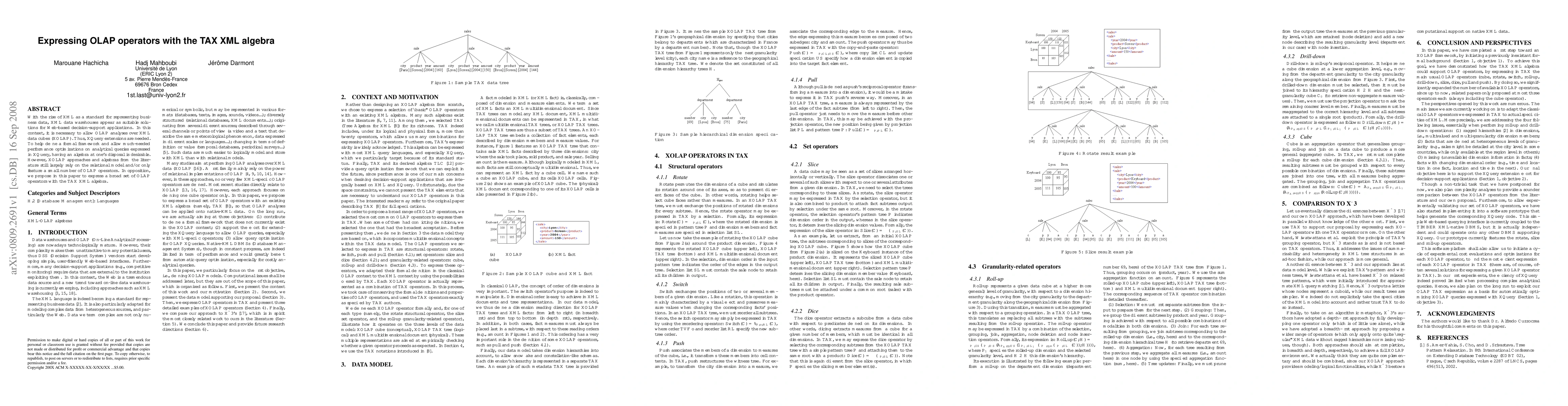 This paper proposes using the TAX XML algebra to express a comprehensive set of OLAP operators for performing analytical queries on XML data warehouses, aiming to enhance performance optimizations and move beyond the limited approaches in existing literature.