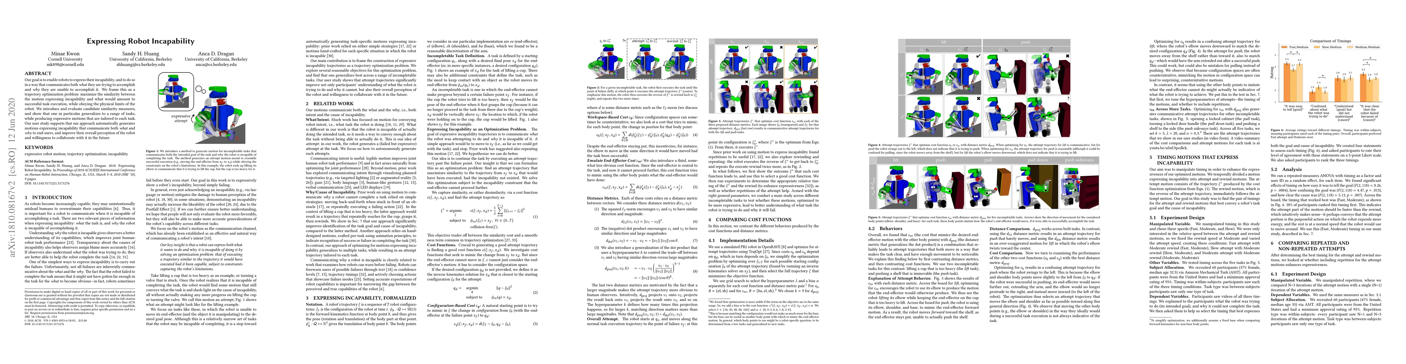 Our goal is to enable robots to express their incapability, and to do so in a way that communicates both what they are trying to accomplish and why they are unable to accomplish it. We frame this as a trajectory optimization problem: maximize the similarity between the motion expressing incapability and what would amount to successful task execution, while obeying the physical limits of the robot. We introduce and evaluate candidate similarity measures, and show that one in particular generalizes to a range of tasks, while producing expressive motions that are tailored to each task. Our user study supports that our approach automatically generates motions expressing incapability that communicate both what and why to end-users, and improve their overall perception of the robot and willingness to collaborate with it in the future.
