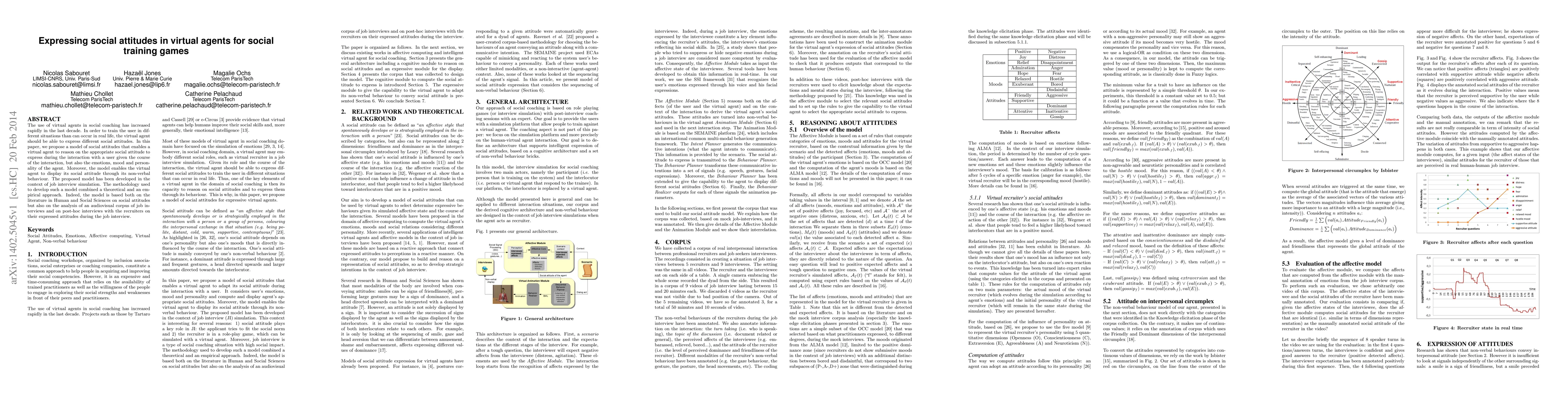 The use of virtual agents in social coaching has increased rapidly in the last decade. In order to train the user in different situations than can occur in real life, the virtual agent should be able to express different social attitudes. In this paper, we propose a model of social attitudes that enables a virtual agent to reason on the appropriate social attitude to express during the interaction with a user given the course of the interaction, but also the emotions, mood and personality of the agent. Moreover, the model enables the virtual agent to display its social attitude through its non-verbal behaviour. The proposed model has been developed in the context of job interview simulation. The methodology used to develop such a model combined a theoretical and an empirical approach. Indeed, the model is based both on the literature in Human and Social Sciences on social attitudes but also on the analysis of an audiovisual corpus of job interviews and on post-hoc interviews with the recruiters on their expressed attitudes during the job interview.