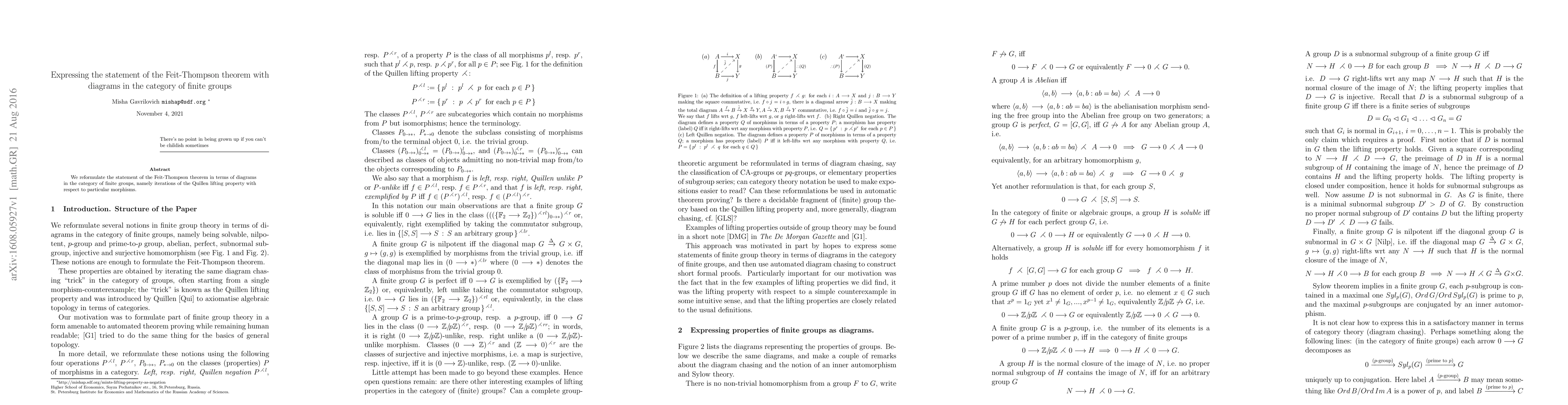 We reformulate the statement of the Feit-Thompson theorem in terms of diagrams in the category of finite groups, namely iterations of the Quillen lifting property with respect to particular morphisms.