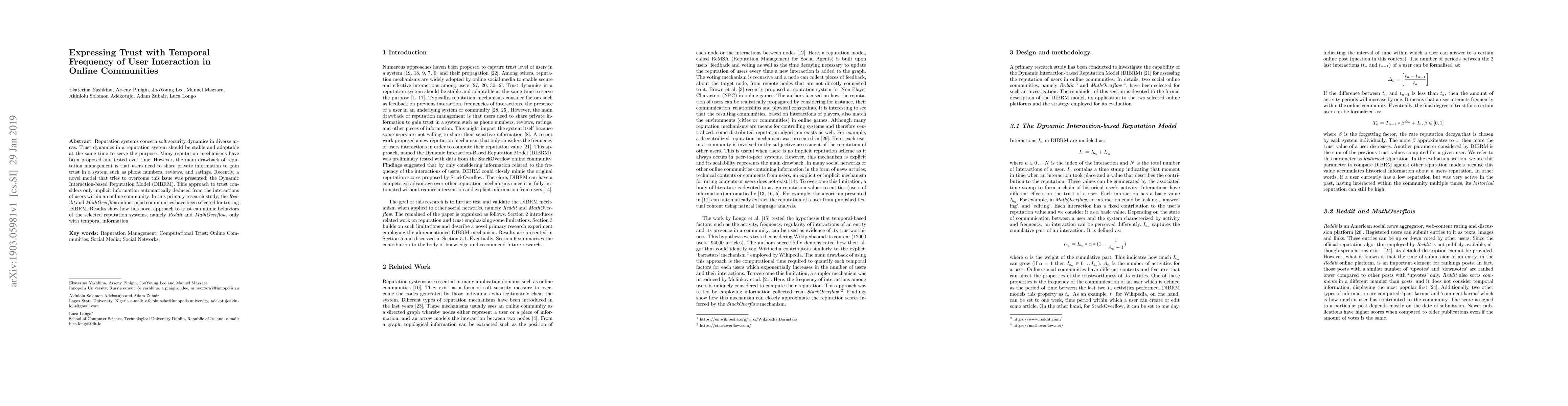 Reputation systems concern soft security dynamics in diverse areas. Trust dynamics in a reputation system should be stable and adaptable at the same time to serve the purpose. Many reputation mechanisms have been proposed and tested over time. However, the main drawback of reputation management is that users need to share private information to gain trust in a system such as phone numbers, reviews, and ratings. Recently, a novel model that tries to overcome this issue was presented: the Dynamic Interaction-based Reputation Model (DIBRM). This approach to trust considers only implicit information automatically deduced from the interactions of users within an online community. In this primary research study, the Reddit and MathOverflow online social communities have been selected for testing DIBRM. Results show how this novel approach to trust can mimic behaviors of the selected reputation systems, namely Reddit and MathOverflow, only with temporal information.