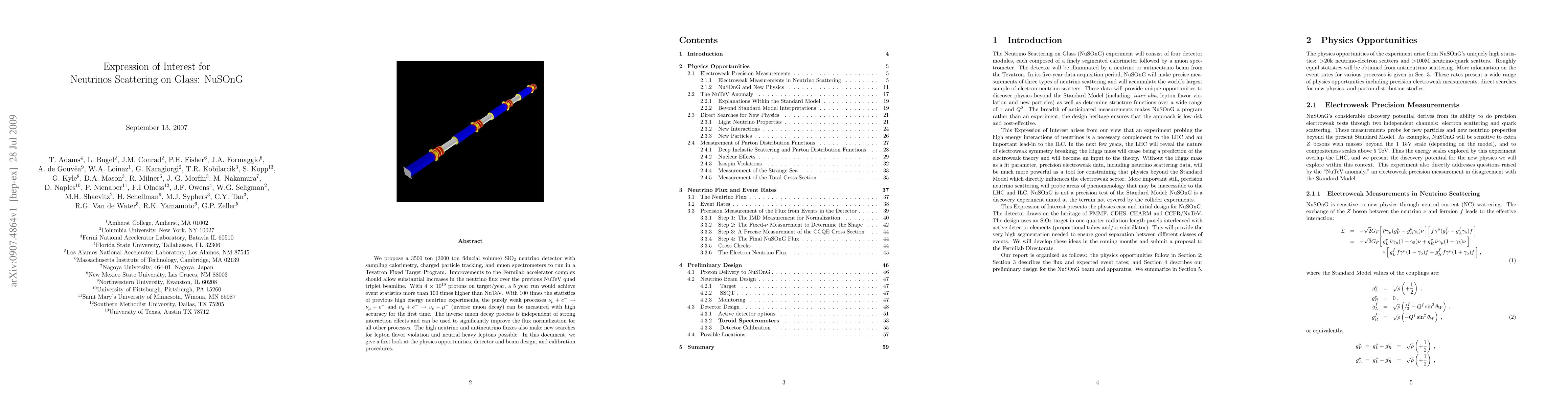 We propose a 3500 ton (3000 ton fiducial volume) SiO_2 neutrino detector with sampling calorimetry, charged particle tracking, and muon spectrometers to run in a Tevatron Fixed Target Program. Improvements to the Fermilab accelerator complex should allow substantial increases in the neutrino flux over the previous NuTeV quad triplet beamline. With 4E19 protons on target/year, a 5 year run would achieve event statistics more than 100 times higher than NuTeV. With 100 times the statistics of previous high energy neutrino experiments, the purely weak processes [\nu_{\mu} e^- \to \nu_{\mu}+ e^-] and [\nu_{\mu} e^- \to \nu_e + \mu^-] (inverse muon decay) can be measured with high accuracy for the first time. The inverse muon decay process is independent of strong interaction effects and can be used to significantly improve the flux normalization for all other processes. The high neutrino and antineutrino fluxes also make new searches for lepton flavor violation and neutral heavy leptons possible. In this document, we give a first look at the physics opportunities, detector and beam design, and calibration procedures.
