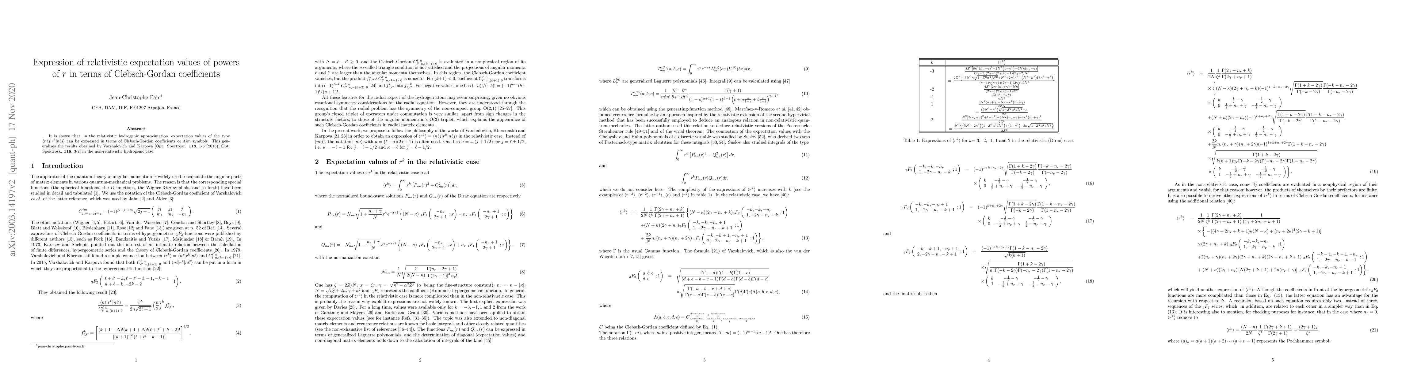 Researchers found that expectation values of powers of distance in atoms can be expressed using Clebsch-Gordan coefficients, a generalization of earlier non-relativistic results. This allows for more precise calculations in relativistic hydrogenic systems.