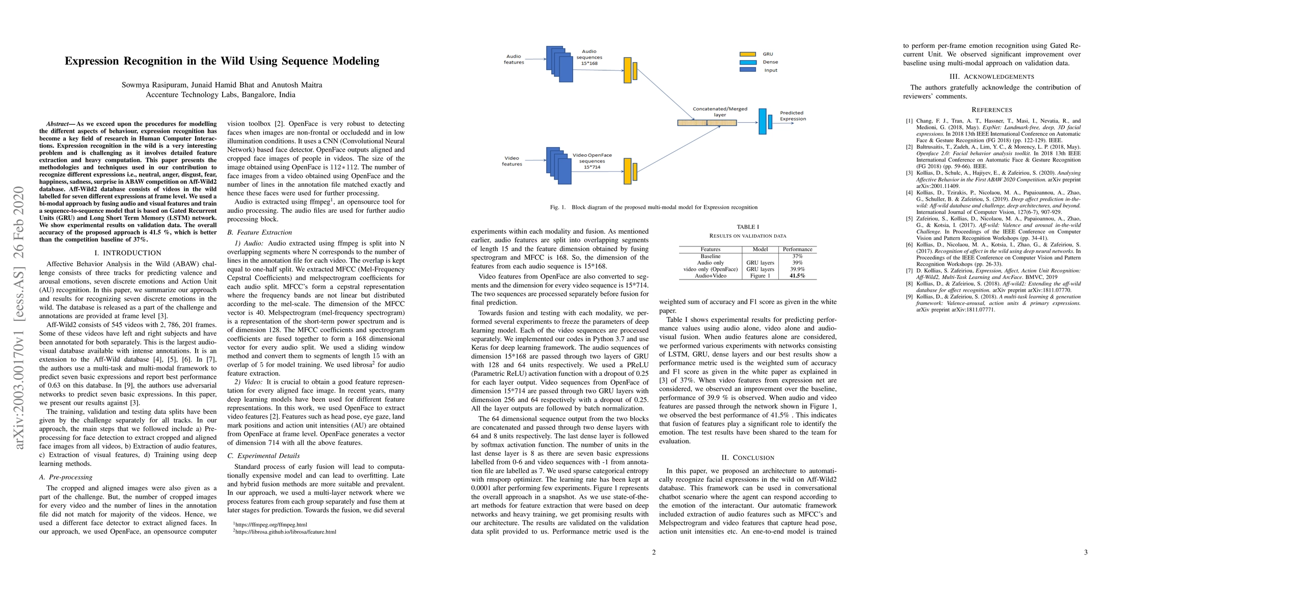 As we exceed upon the procedures for modelling the different aspects of behaviour, expression recognition has become a key field of research in Human Computer Interactions. Expression recognition in the wild is a very interesting problem and is challenging as it involves detailed feature extraction and heavy computation. This paper presents the methodologies and techniques used in our contribution to recognize different expressions i.e., neutral, anger, disgust, fear, happiness, sadness, surprise in ABAW competition on Aff-Wild2 database. Aff-Wild2 database consists of videos in the wild labelled for seven different expressions at frame level. We used a bi-modal approach by fusing audio and visual features and train a sequence-to-sequence model that is based on Gated Recurrent Units (GRU) and Long Short Term Memory (LSTM) network. We show experimental results on validation data. The overall accuracy of the proposed approach is 41.5 \%, which is better than the competition baseline of 37\%.
