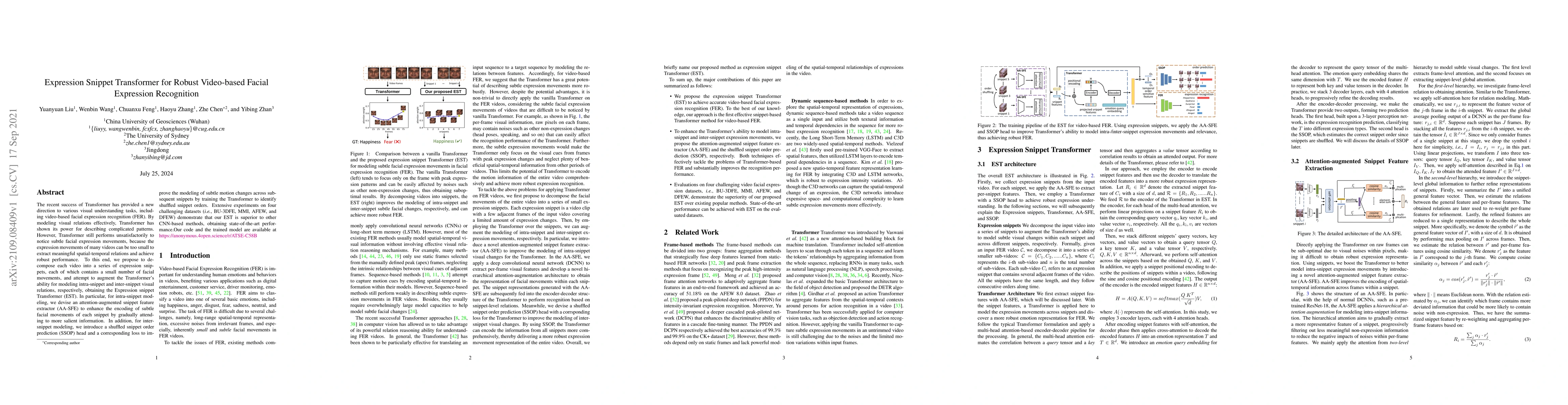 The paper proposes the Expression Snippet Transformer (EST) to enhance video-based facial expression recognition by decomposing videos into expression snippets and augmenting Transformer's modeling of intra-snippet and inter-snippet visual relations. The EST achieves state-of-the-art performance on four datasets by effectively capturing subtle facial movements.