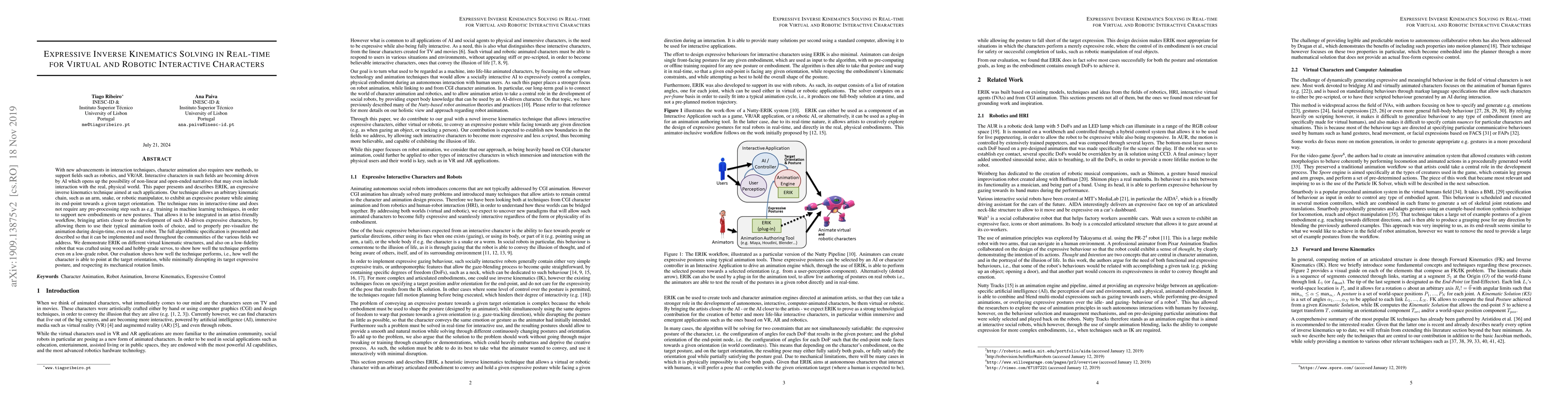With new advancements in interaction techniques, character animation also requires new methods, to support fields such as robotics, and VR/AR. Interactive characters in such fields are becoming driven by AI which opens up the possibility of non-linear and open-ended narratives that may even include interaction with the real, physical world. This paper presents and describes ERIK, an expressive inverse kinematics technique aimed at such applications. Our technique allows an arbitrary kinematic chain, such as an arm, snake, or robotic manipulator, to exhibit an expressive posture while aiming its end-point towards a given target orientation. The technique runs in interactive-time and does not require any pre-processing step such as e.g. training in machine learning techniques, in order to support new embodiments or new postures. That allows it to be integrated in an artist-friendly workflow, bringing artists closer to the development of such AI-driven expressive characters, by allowing them to use their typical animation tools of choice, and to properly pre-visualize the animation during design-time, even on a real robot. The full algorithmic specification is presented and described so that it can be implemented and used throughout the communities of the various fields we address. We demonstrate ERIK on different virtual kinematic structures, and also on a low-fidelity robot that was crafted using wood and hobby-grade servos, to show how well the technique performs even on a low-grade robot. Our evaluation shows how well the technique performs, i.e., how well the character is able to point at the target orientation, while minimally disrupting its target expressive posture, and respecting its mechanical rotation limits.