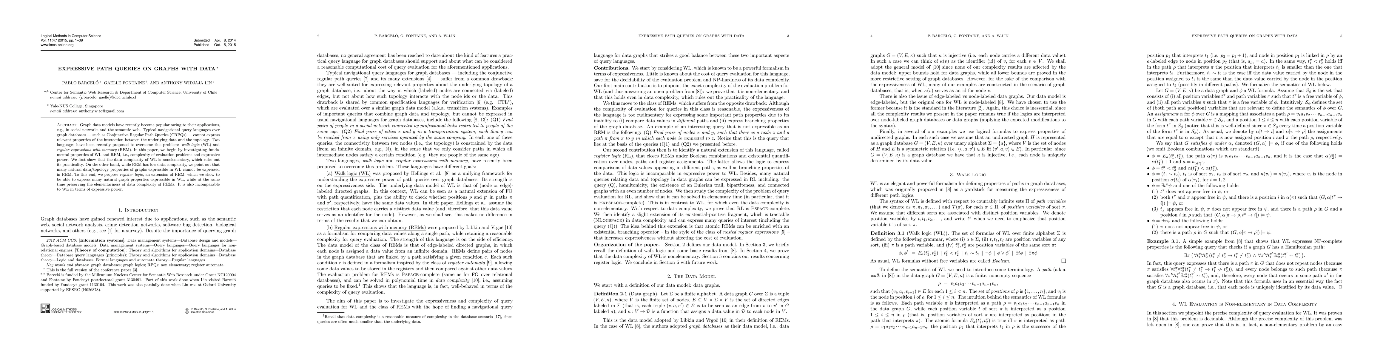 Researchers investigated two query languages for graph data: walk logic (WL) and regular expressions with memory (REM). They found that WL has non-elementary data complexity but proposed a new language called register logic to overcome this limitation while preserving the expressive power of REMs.