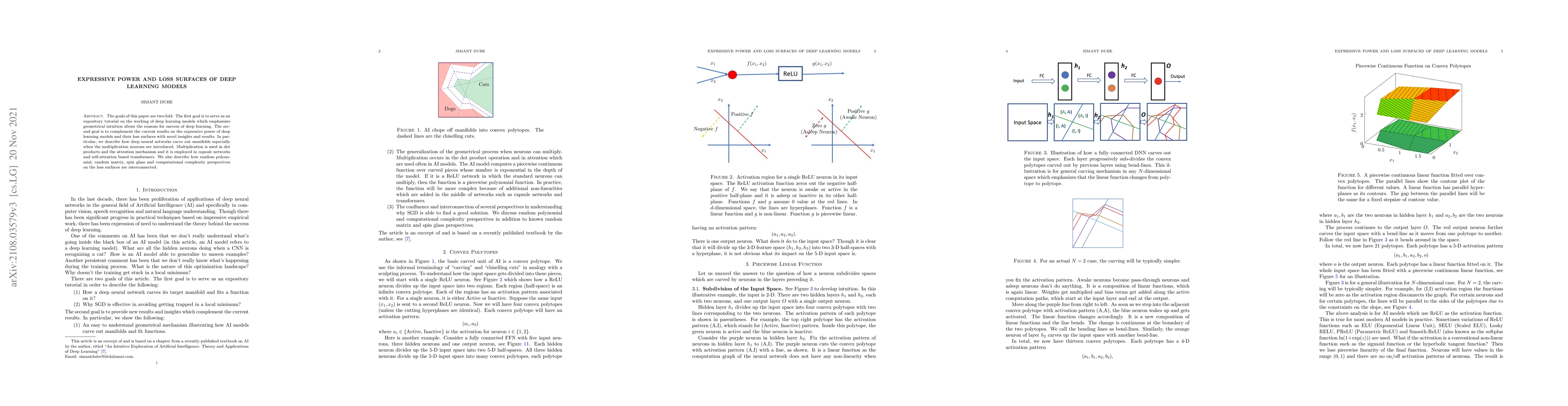 The goals of this paper are two-fold. The first goal is to serve as an expository tutorial on the working of deep learning models which emphasizes geometrical intuition about the reasons for success of deep learning. The second goal is to complement the current results on the expressive power of deep learning models and their loss surfaces with novel insights and results. In particular, we describe how deep neural networks carve out manifolds especially when the multiplication neurons are introduced. Multiplication is used in dot products and the attention mechanism and it is employed in capsule networks and self-attention based transformers. We also describe how random polynomial, random matrix, spin glass and computational complexity perspectives on the loss surfaces are interconnected.