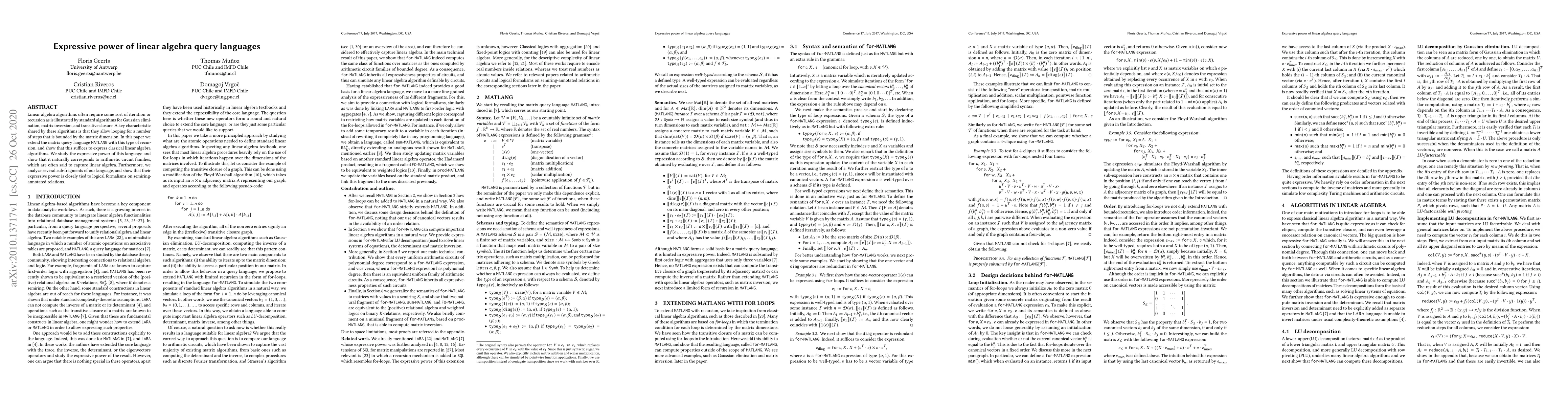 This paper extends MATLANG, a matrix query language, to include bounded recursion, enabling it to express classical linear algebra algorithms like Gaussian elimination and matrix inversion. The authors demonstrate that this extended language corresponds to arithmetic circuit families, highlighting its expressive power and linking it to logical formalisms on semiring-annotated relations.