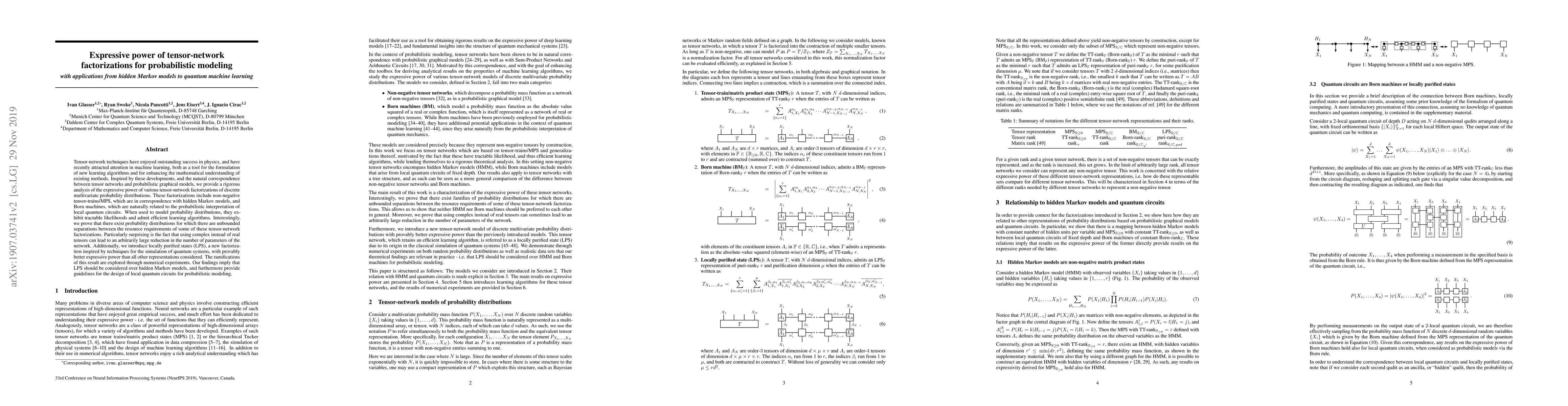 Tensor-network techniques have enjoyed outstanding success in physics, and have recently attracted attention in machine learning, both as a tool for the formulation of new learning algorithms and for enhancing the mathematical understanding of existing methods. Inspired by these developments, and the natural correspondence between tensor networks and probabilistic graphical models, we provide a rigorous analysis of the expressive power of various tensor-network factorizations of discrete multivariate probability distributions. These factorizations include non-negative tensor-trains/MPS, which are in correspondence with hidden Markov models, and Born machines, which are naturally related to local quantum circuits. When used to model probability distributions, they exhibit tractable likelihoods and admit efficient learning algorithms. Interestingly, we prove that there exist probability distributions for which there are unbounded separations between the resource requirements of some of these tensor-network factorizations. Particularly surprising is the fact that using complex instead of real tensors can lead to an arbitrarily large reduction in the number of parameters of the network. Additionally, we introduce locally purified states (LPS), a new factorization inspired by techniques for the simulation of quantum systems, with provably better expressive power than all other representations considered. The ramifications of this result are explored through numerical experiments. Our findings imply that LPS should be considered over hidden Markov models, and furthermore provide guidelines for the design of local quantum circuits for probabilistic modeling.