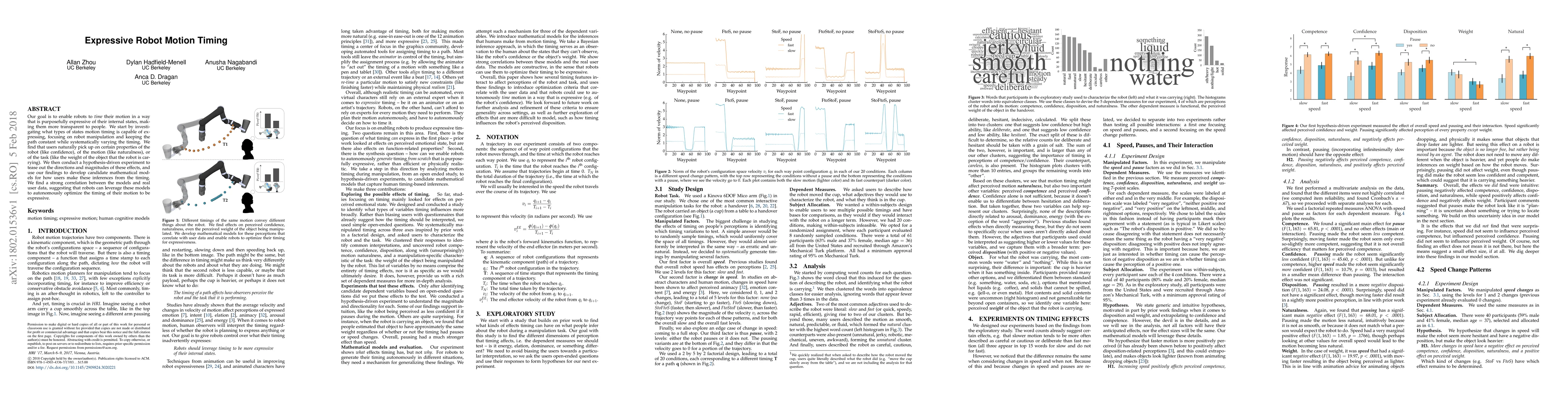 This paper investigates how robots can time their motion to express internal states more transparently to humans, finding that variations in timing can convey properties like confidence and naturalness. The study develops mathematical models correlating these timing variations with user perceptions, suggesting robots can autonomously optimize motion timing for expressiveness.