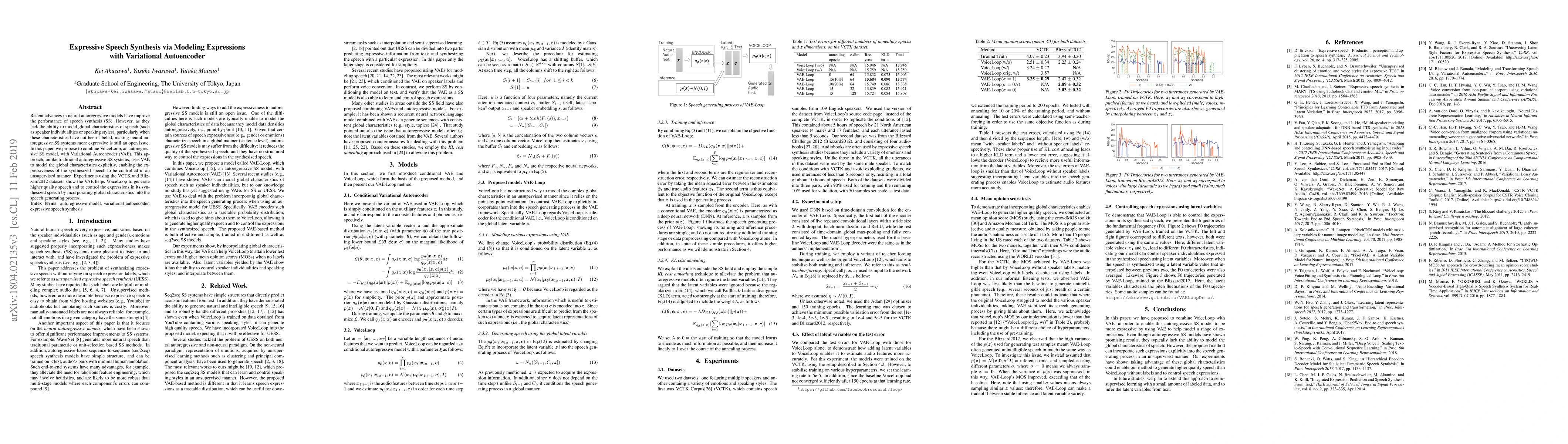 This paper combines VoiceLoop, an autoregressive speech synthesis model, with a Variational Autoencoder to model global speech characteristics, enhancing expressiveness without labeled data. Experiments demonstrate improved speech quality and expression control using VCTK and Blizzard2012 datasets.
