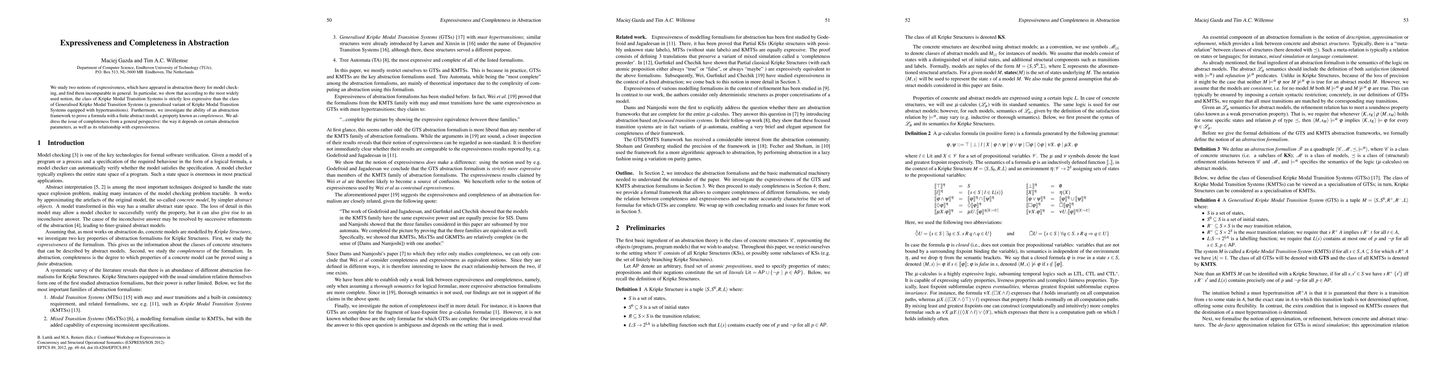 We study two notions of expressiveness, which have appeared in abstraction theory for model checking, and find them incomparable in general. In particular, we show that according to the most widely used notion, the class of Kripke Modal Transition Systems is strictly less expressive than the class of Generalised Kripke Modal Transition Systems (a generalised variant of Kripke Modal Transition Systems equipped with hypertransitions). Furthermore, we investigate the ability of an abstraction framework to prove a formula with a finite abstract model, a property known as completeness. We address the issue of completeness from a general perspective: the way it depends on certain abstraction parameters, as well as its relationship with expressiveness.