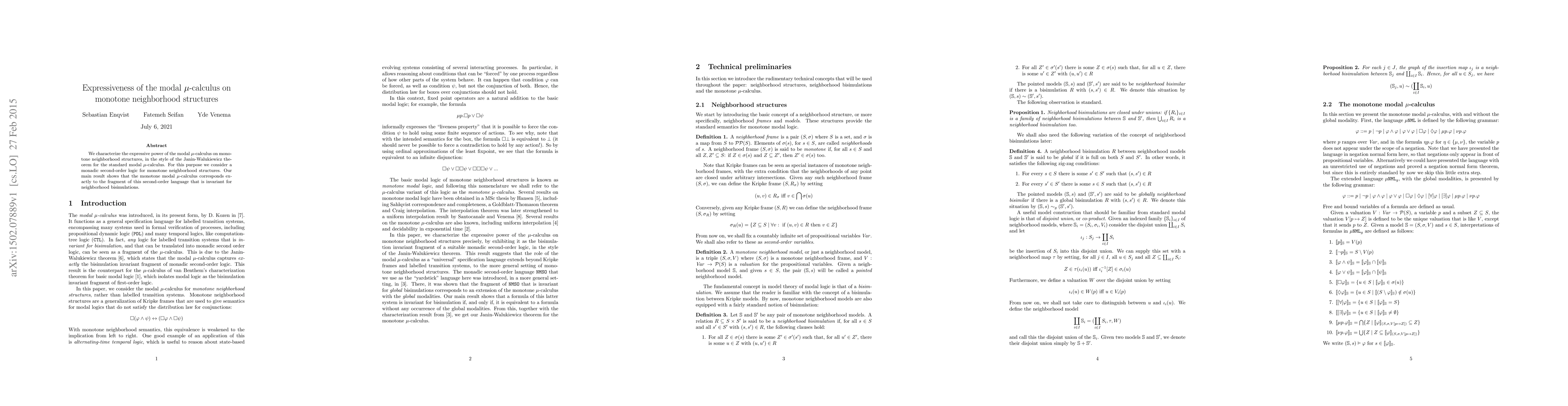 This paper characterizes the expressive power of the modal mu-calculus on monotone neighborhood structures, showing it corresponds precisely to a specific fragment of monadic second-order logic invariant under neighborhood bisimulations. This parallels the Janin-Walukiewicz theorem for standard modal mu-calculus.