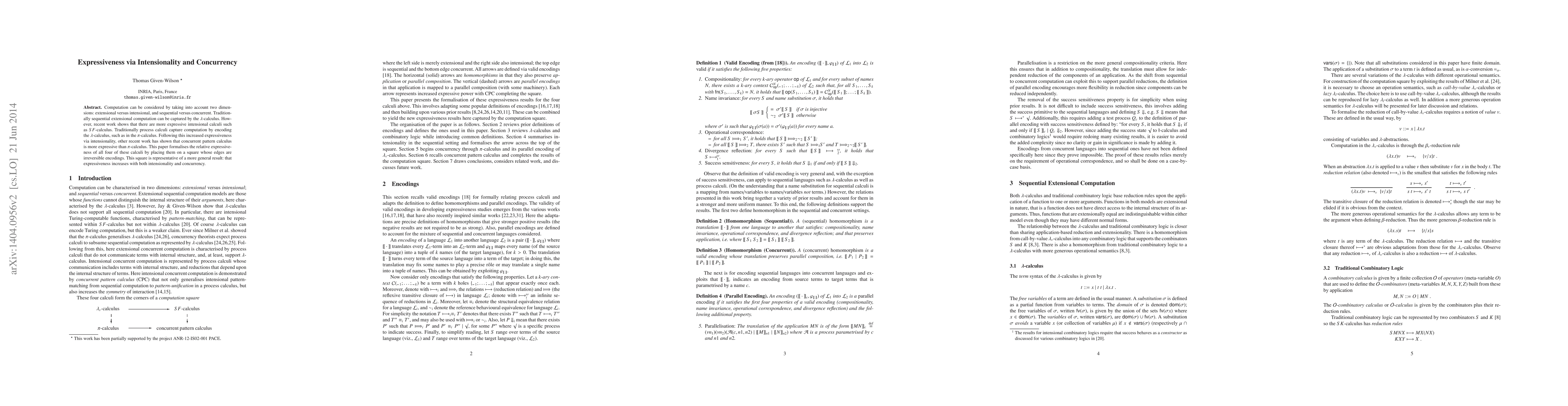 This paper formalizes the relative expressiveness of four computational calculi: lambda-calculus, SF-calculus, pi-calculus, and concurrent pattern calculus. It demonstrates that expressiveness increases with both intensionality and concurrency, placing these calculi on a square to illustrate their relative positions.