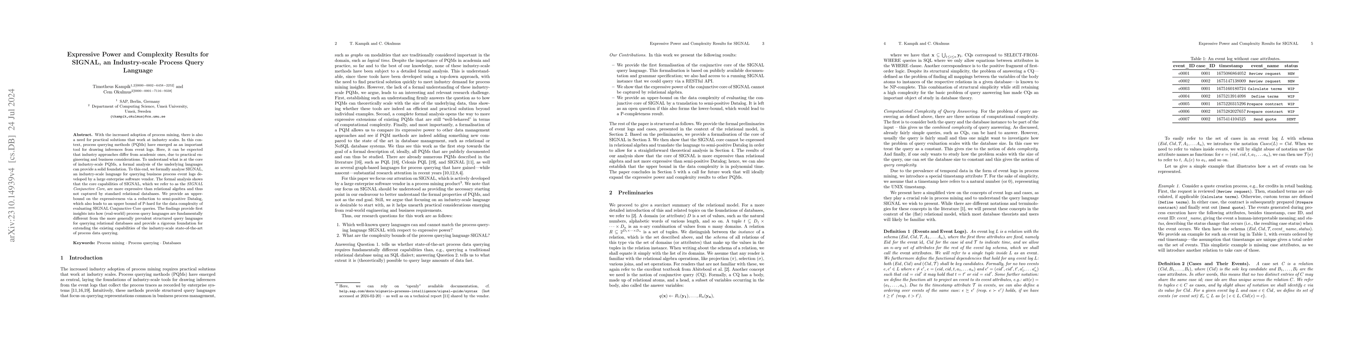 This research distinguishes itself by focusing on the expressivity and complexity of a specific industry-scale query language (SIGNAL Conjunctive Core) rather than generic process query languages, providing concrete insights into the unique characteristics of real-world process querying.