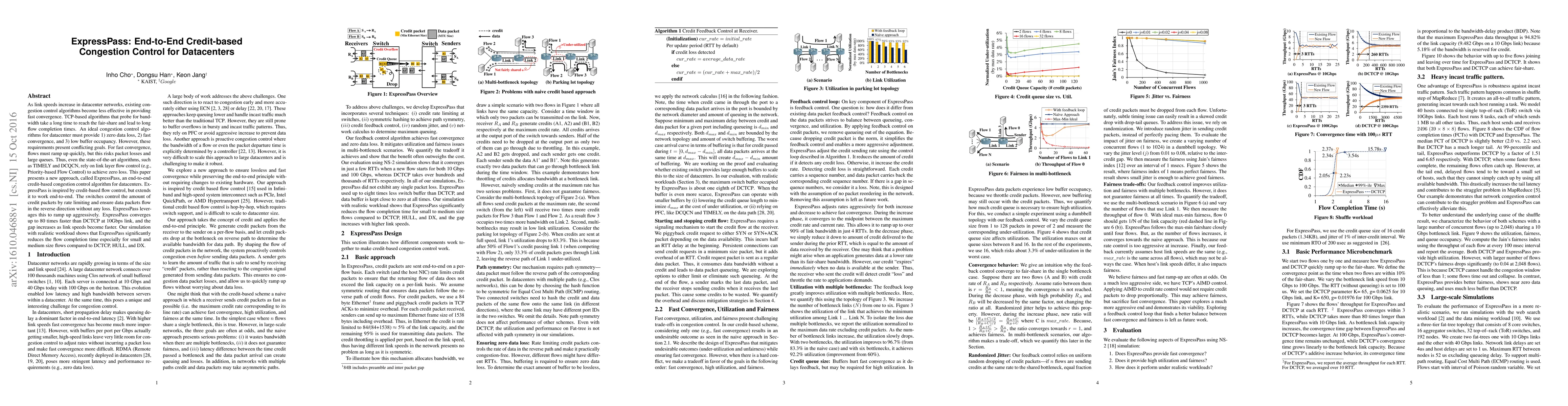 ExpressPass is an end-to-end credit-based congestion control algorithm designed for datacenters to achieve fast convergence, zero data loss, and low buffer occupancy. It outperforms existing TCP-based algorithms, converging up to 80 times faster than DCTCP at 10Gbps and significantly reducing flow completion times for small and medium flows.