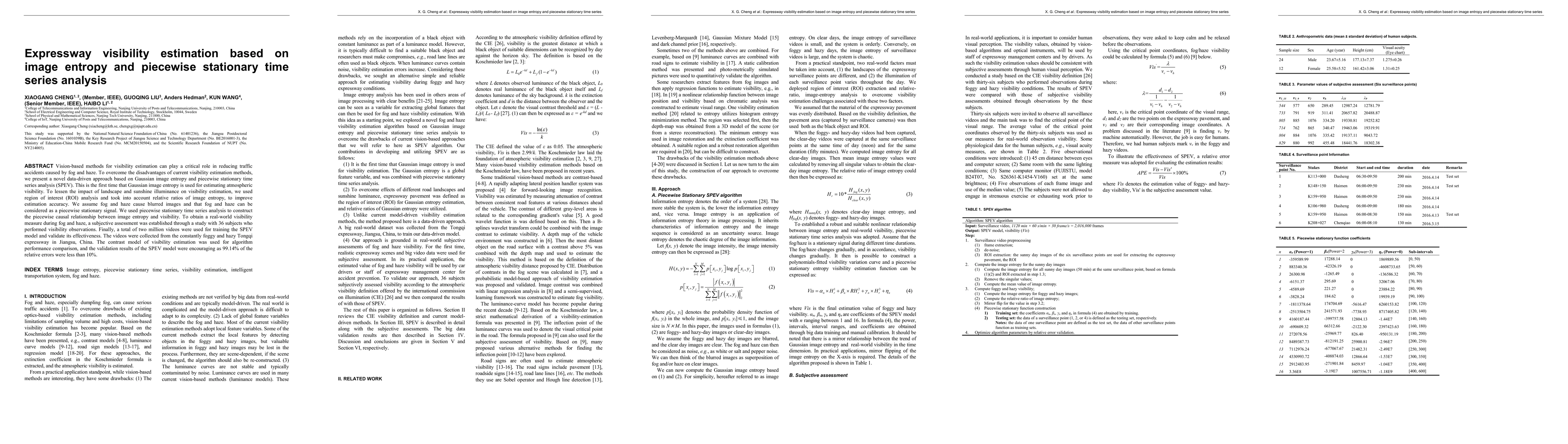 Vision-based methods for visibility estimation can play a critical role in reducing traffic accidents caused by fog and haze. To overcome the disadvantages of current visibility estimation methods, we present a novel data-driven approach based on Gaussian image entropy and piecewise stationary time series analysis (SPEV). This is the first time that Gaussian image entropy is used for estimating atmospheric visibility. To lessen the impact of landscape and sunshine illuminance on visibility estimation, we used region of interest (ROI) analysis and took into account relative ratios of image entropy, to improve estimation accuracy. We assume fog and haze cause blurred images and that fog and haze can be considered as a piecewise stationary signal. We used piecewise stationary time series analysis to construct the piecewise causal relationship between image entropy and visibility. To obtain a real-world visibility measure during fog and haze, a subjective assessment was established through a study with 36 subjects who performed visibility observations. Finally, a total of two million videos were used for training the SPEV model and validate its effectiveness. The videos were collected from the constantly foggy and hazy Tongqi expressway in Jiangsu, China. The contrast model of visibility estimation was used for algorithm performance comparison, and the validation results of the SPEV model were encouraging as 99.14% of the relative errors were less than 10%.