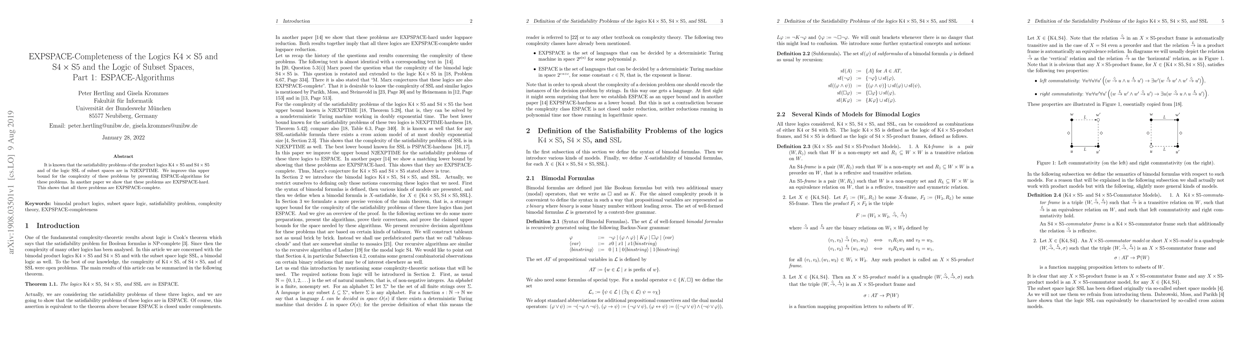 It is known that the satisfiability problems of the product logics K4xS5 and S4xS5 and of the logic SSL of subset spaces are in N2EXPTIME. We improve this upper bound for the complexity of these problems by presenting ESPACE-algorithms for these problems. In another paper we show that these problems are EXPSPACE-hard. This shows that all three problems are EXPSPACE-complete.