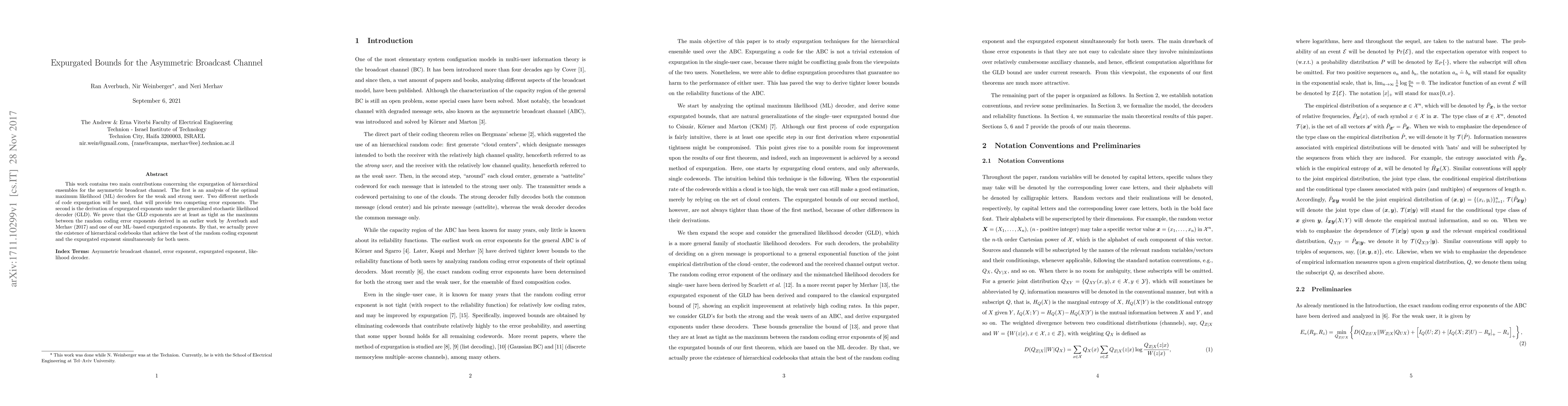 This paper analyzes optimal maximum likelihood decoders for the asymmetric broadcast channel, comparing two code expurgation methods to derive error exponents. It also proves that generalized stochastic likelihood decoder exponents are at least as tight as the maximum of previously derived random coding error exponents, establishing the existence of hierarchical codebooks achieving both the random coding and expurgated exponents.