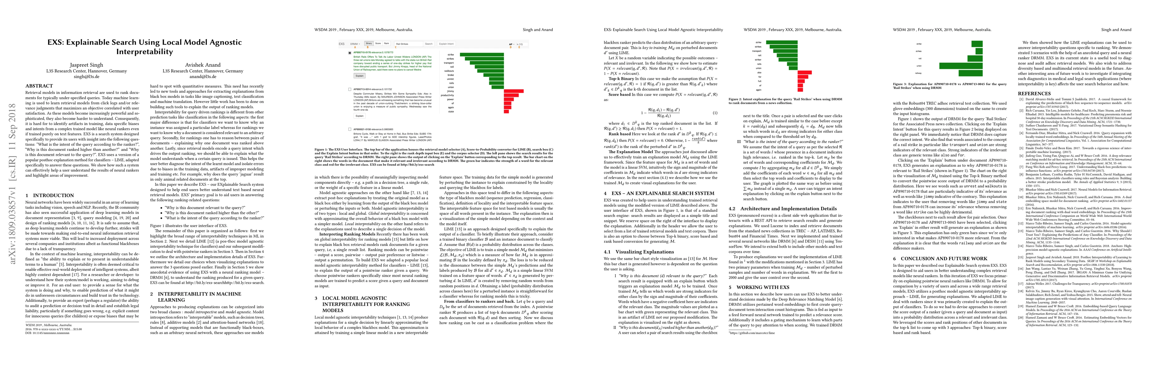 Retrieval models in information retrieval are used to rank documents for typically under-specified queries. Today machine learning is used to learn retrieval models from click logs and/or relevance judgments that maximizes an objective correlated with user satisfaction. As these models become increasingly powerful and sophisticated, they also become harder to understand. Consequently, it is hard for to identify artifacts in training, data specific biases and intents from a complex trained model like neural rankers even if trained purely on text features. EXS is a search system designed specifically to provide its users with insight into the following questions: `What is the intent of the query according to the ranker?', `Why is this document ranked higher than another?' and `Why is this document relevant to the query?'. EXS uses a version of a popular posthoc explanation method for classifiers -- LIME, adapted specifically to answer these questions. We show how such a system can effectively help a user understand the results of neural rankers and highlight areas of improvement.