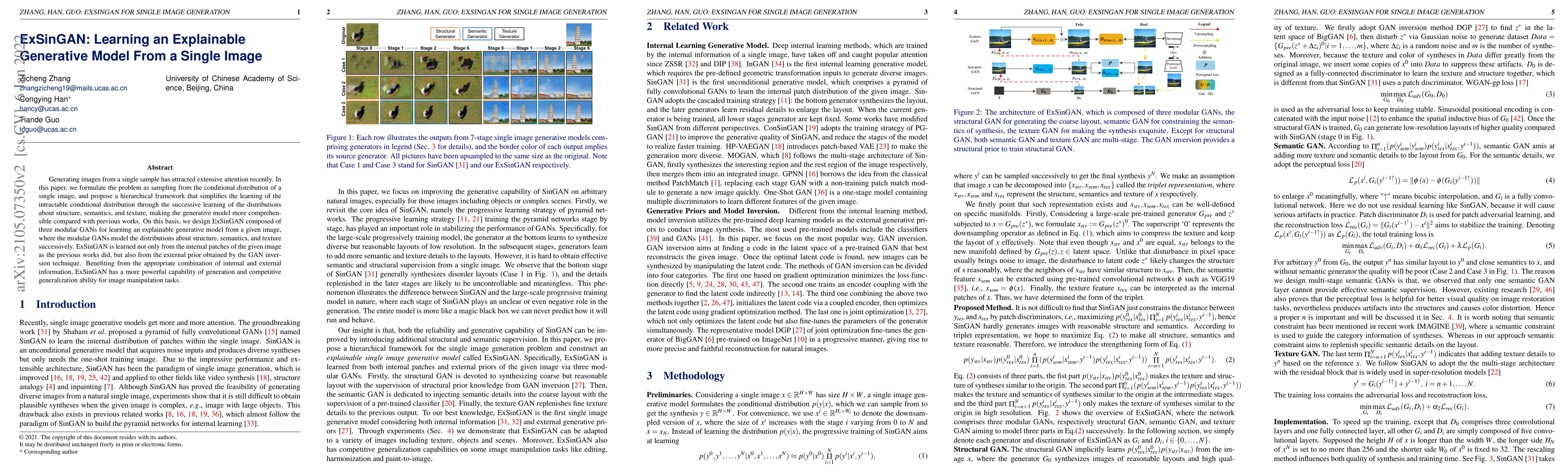 ExSinGAN proposes a hierarchical framework using three cascaded GANs to learn an explainable generative model from a single image, incorporating both internal image patches and external priors for enhanced generation and generalization. This approach simplifies the learning of intricate conditional distributions related to structure, semantics, and texture.