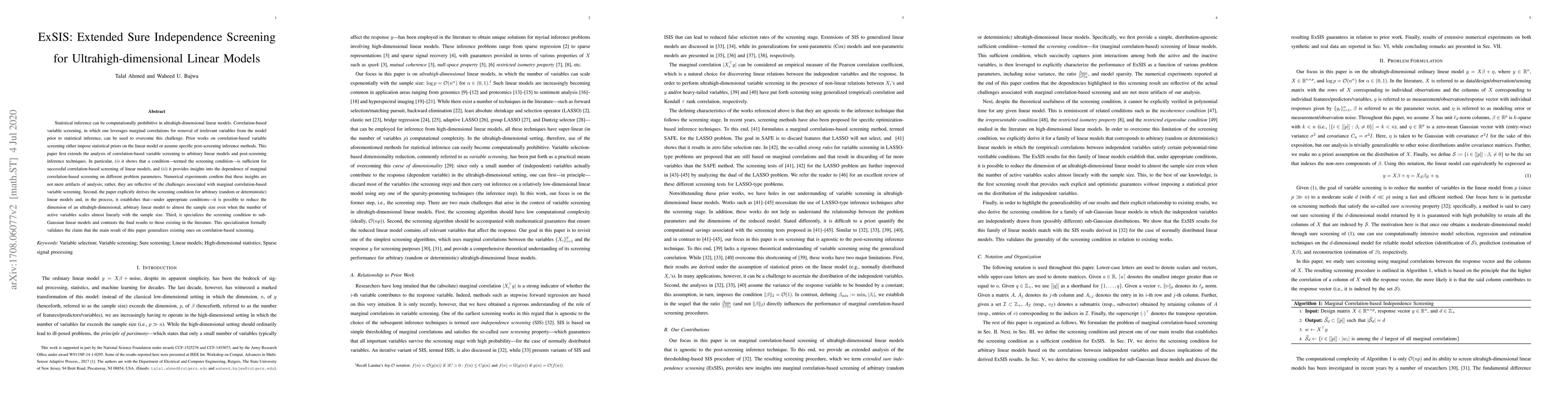 This paper extends correlation-based variable screening for ultrahigh-dimensional linear models, showing a sufficient "screening condition" for successful screening and analyzing its dependence on problem parameters. It demonstrates the potential to reduce model dimensions significantly under appropriate conditions.
