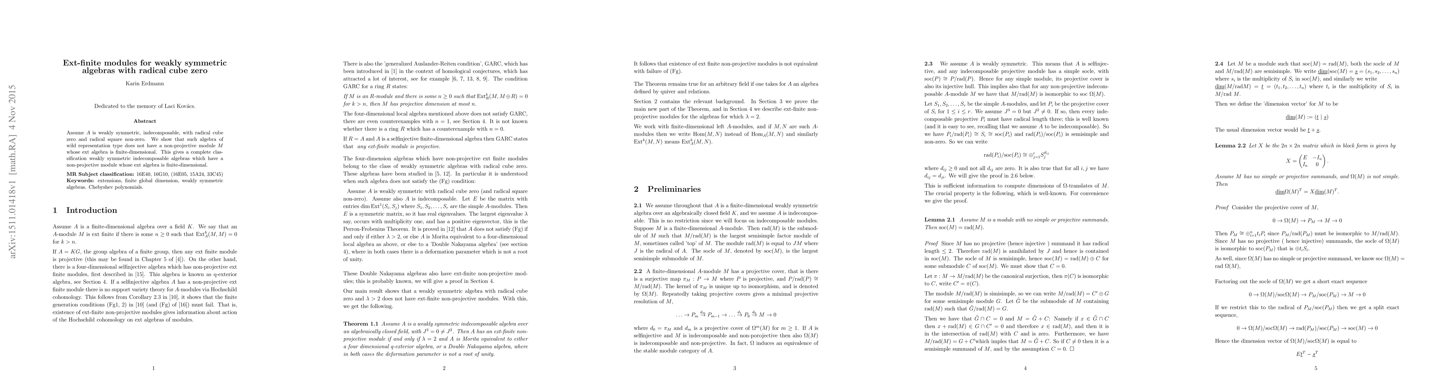 This paper classifies weakly symmetric, indecomposable algebras with radical cube zero, proving that those with radical square non-zero and wild representation type cannot have a non-projective module with finite-dimensional ext algebra. This provides a complete classification of such algebras under these conditions.