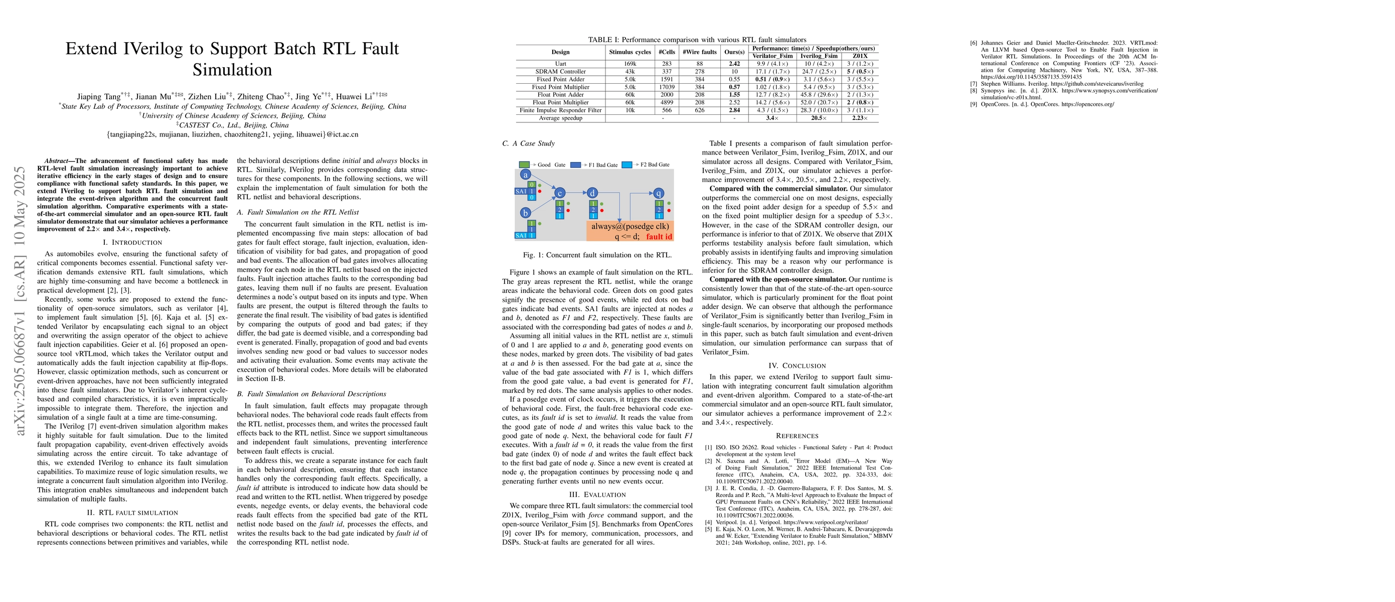 The paper extends IVerilog by integrating event-driven and concurrent fault simulation algorithms to support batch RTL fault simulation.