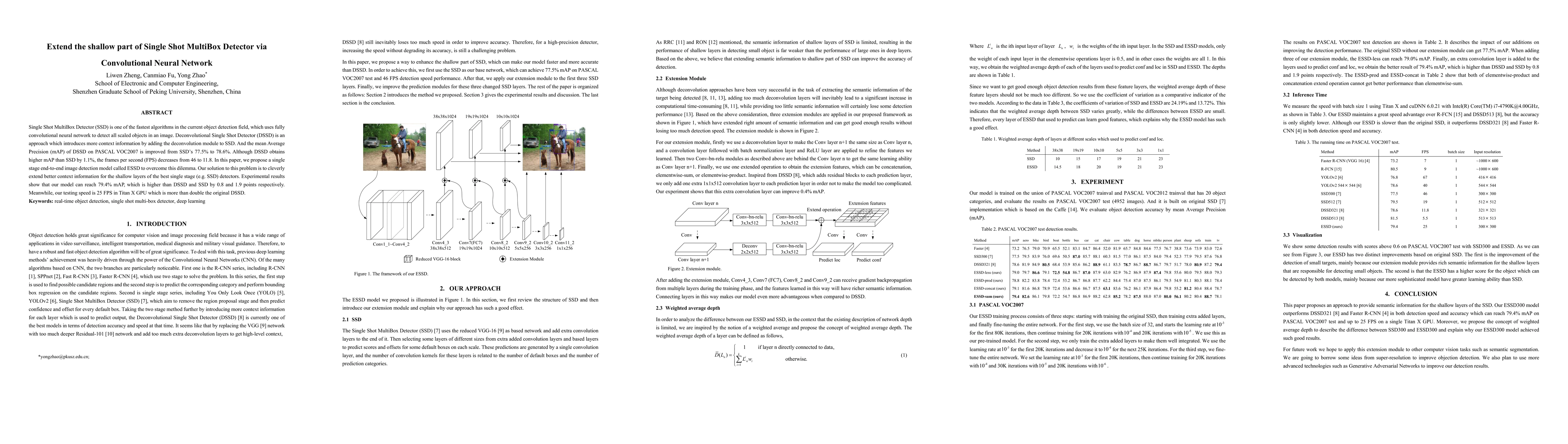 Single Shot MultiBox Detector (SSD) is one of the fastest algorithms in the current object detection field, which uses fully convolutional neural network to detect all scaled objects in an image. Deconvolutional Single Shot Detector (DSSD) is an approach which introduces more context information by adding the deconvolution module to SSD. And the mean Average Precision (mAP) of DSSD on PASCAL VOC2007 is improved from SSD's 77.5% to 78.6%. Although DSSD obtains higher mAP than SSD by 1.1%, the frames per second (FPS) decreases from 46 to 11.8. In this paper, we propose a single stage end-to-end image detection model called ESSD to overcome this dilemma. Our solution to this problem is to cleverly extend better context information for the shallow layers of the best single stage (e.g. SSD) detectors. Experimental results show that our model can reach 79.4% mAP, which is higher than DSSD and SSD by 0.8 and 1.9 points respectively. Meanwhile, our testing speed is 25 FPS in Titan X GPU which is more than double the original DSSD.