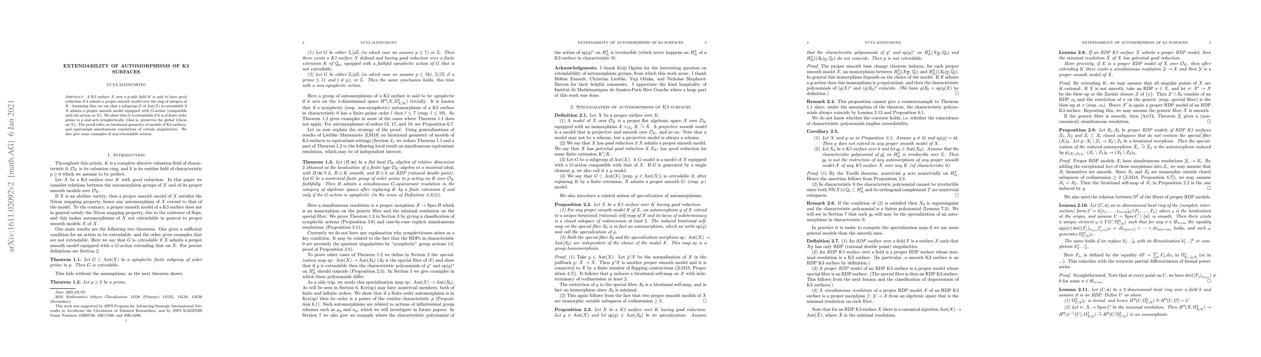 Researchers prove that automorphisms of K3 surfaces with finite order prime to p and symplectic actions can be extended to proper smooth models, using birational geometry and equivariant simultaneous resolutions of singularities.