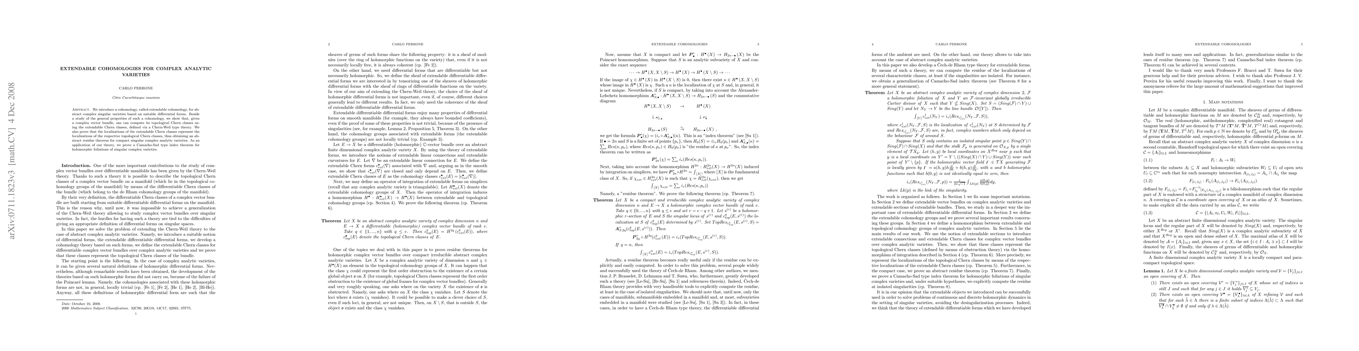 We introduce a cohomology, called extendable cohomology, for abstract complex singular varieties based on suitable differential forms. Beside a study of the general properties of such a cohomology, we show that, given a complex vector bundle, one can compute its topological Chern classes using the extendable Chern classes, defined via a Chern-Weil type theory. We also prove that the localizations of the extendable Chern classes represent the localizations of the respective topological Chern classes, thus obtaining an abstract residue theorem for compact singular complex analytic varieties. As an application of our theory, we prove a Camacho-Sad type index theorem for holomorphic foliations of singular complex varieties.